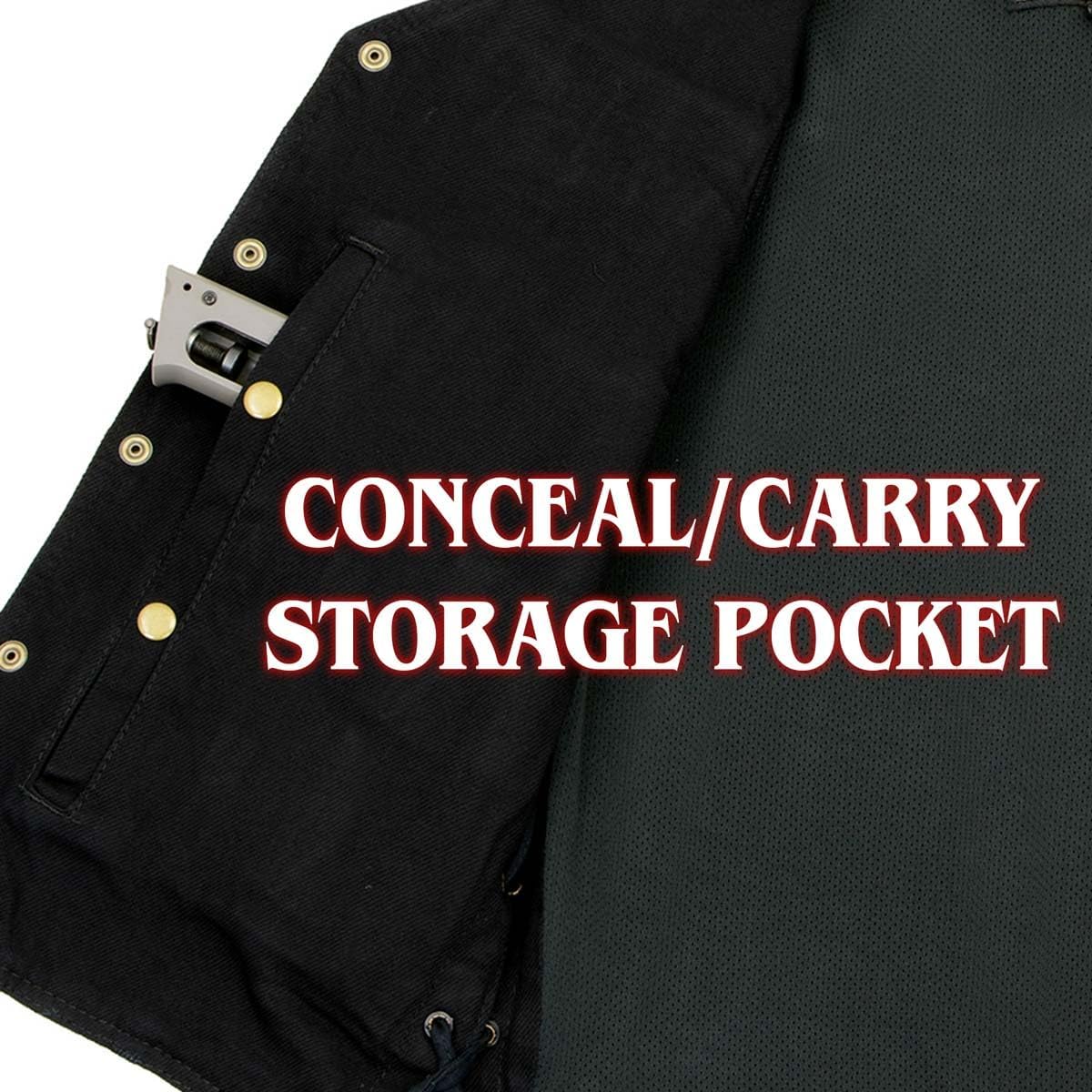 ✅ Pocket Features | Our denim biker vest for men is designed with dual inside conceal and carry storage pockets (can be used a regular storage pockets). It features strategically placed pockets with secure closures, allowing you to discreetly carry your protection while maintaining a sleek and stylish look | 2 chest pockets with flap and snap button closure | 2 outside lower hand pockets.