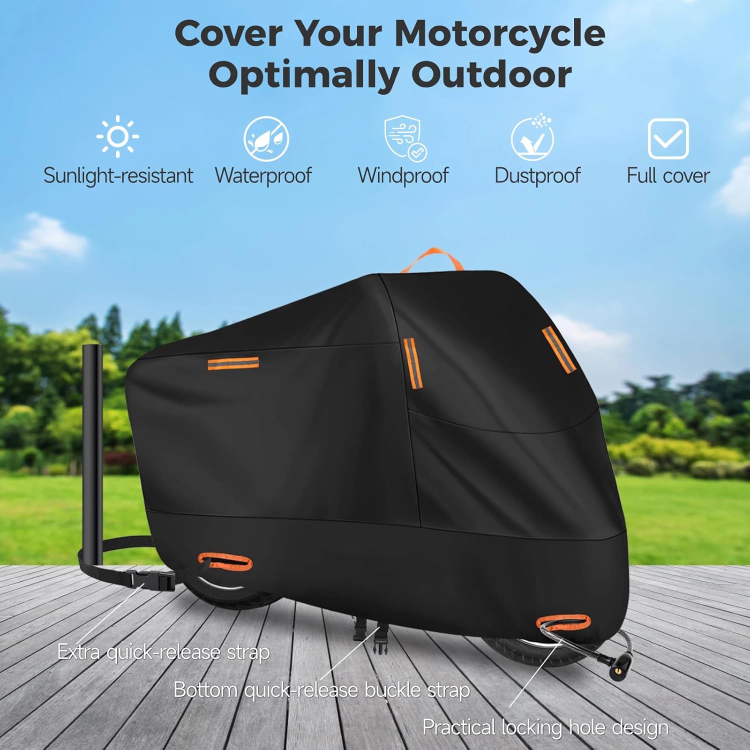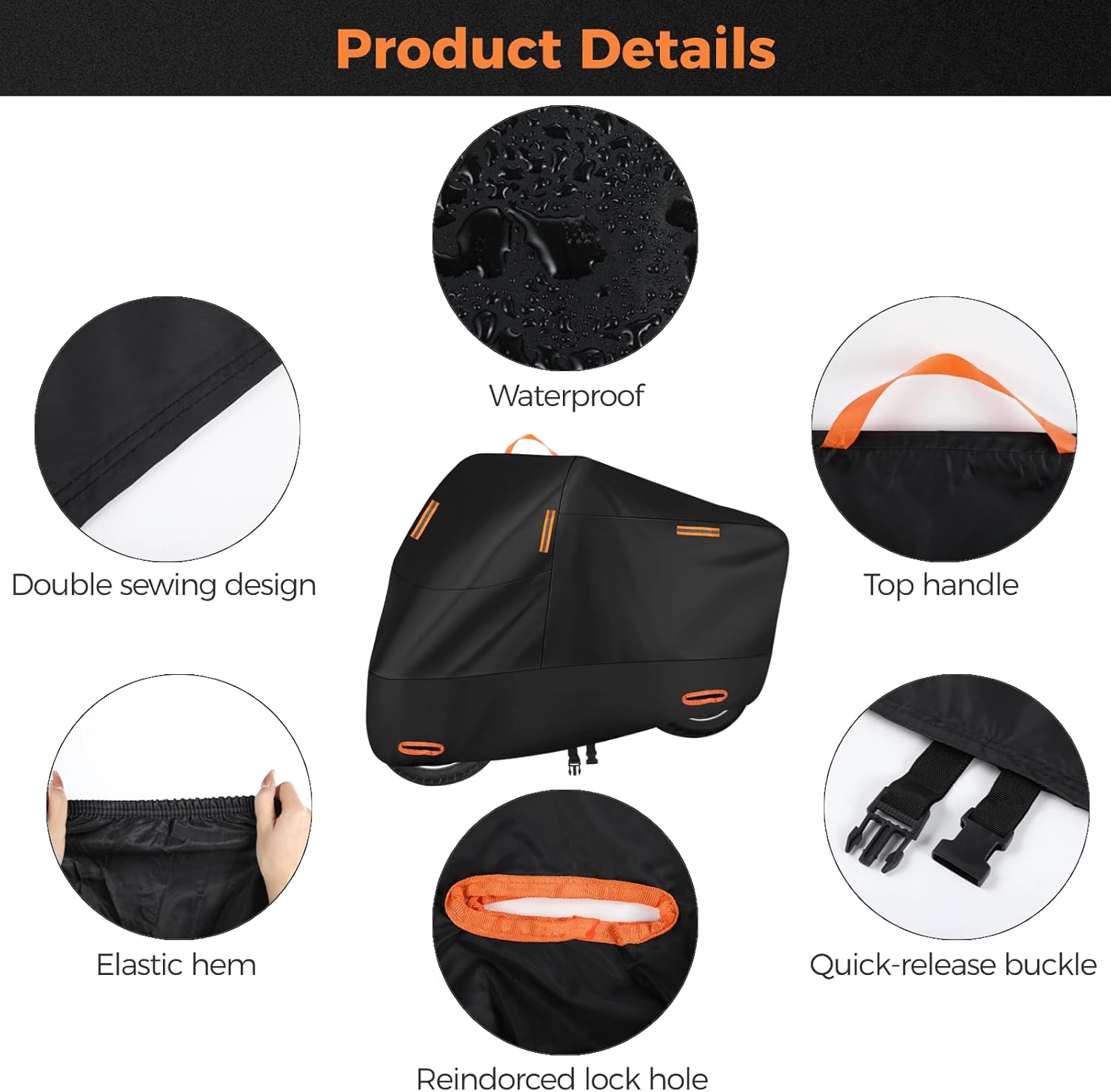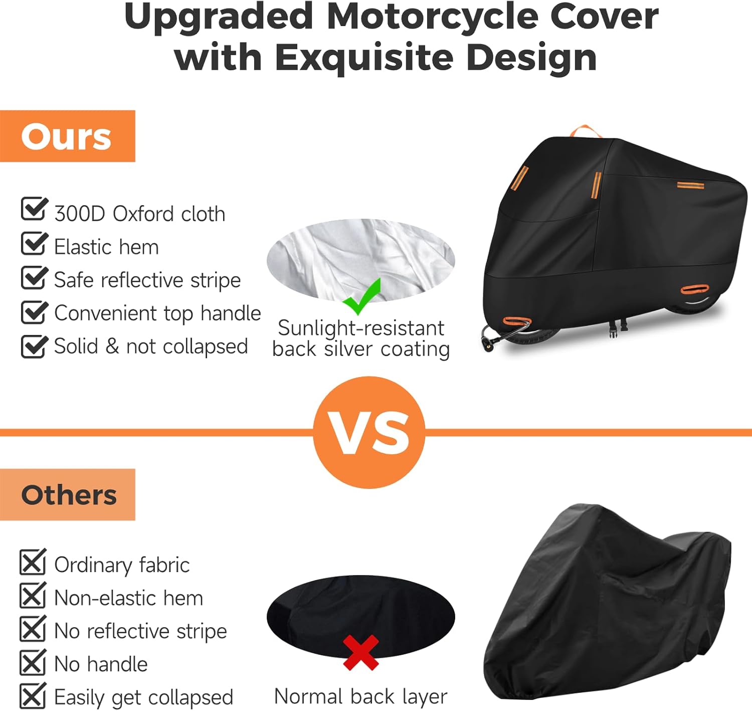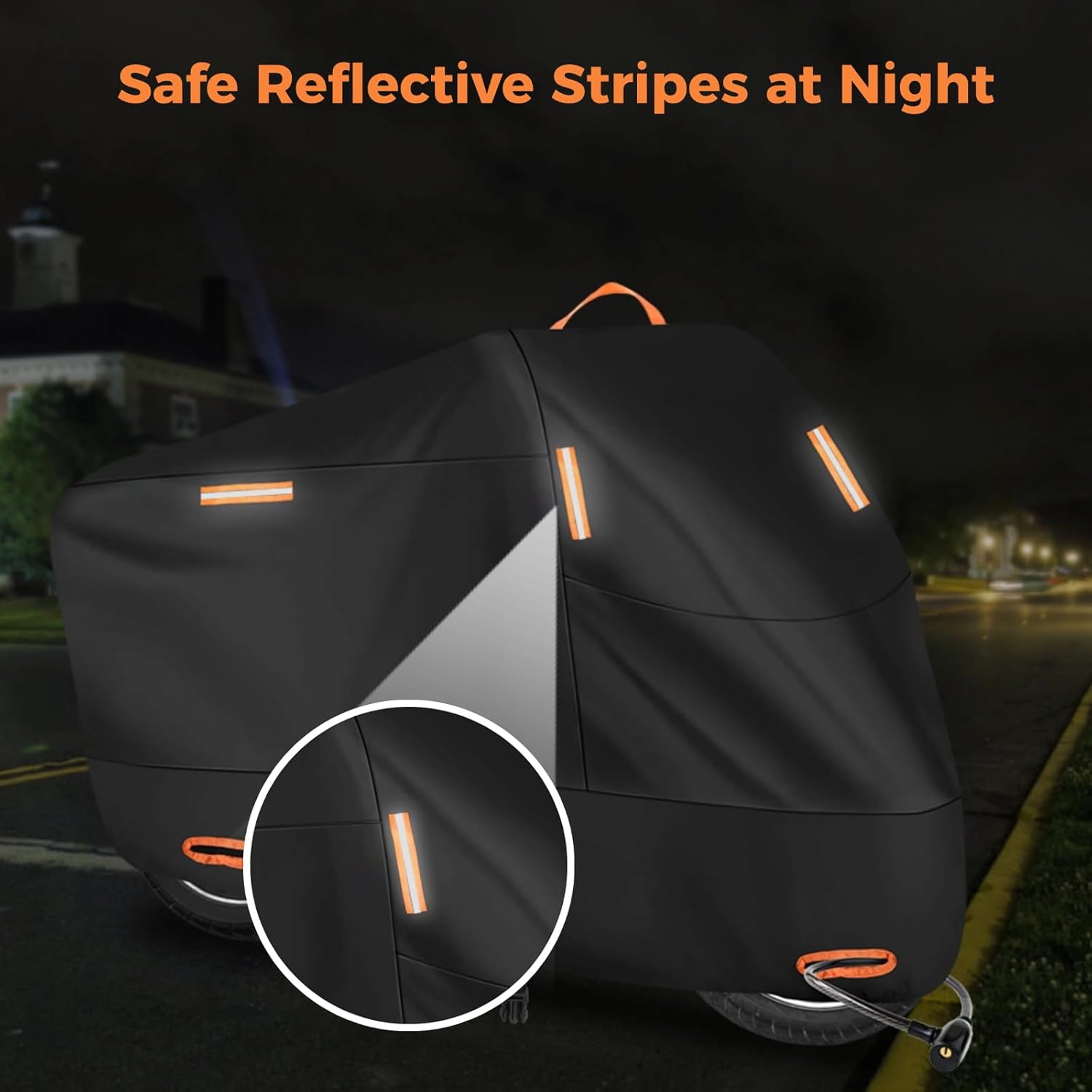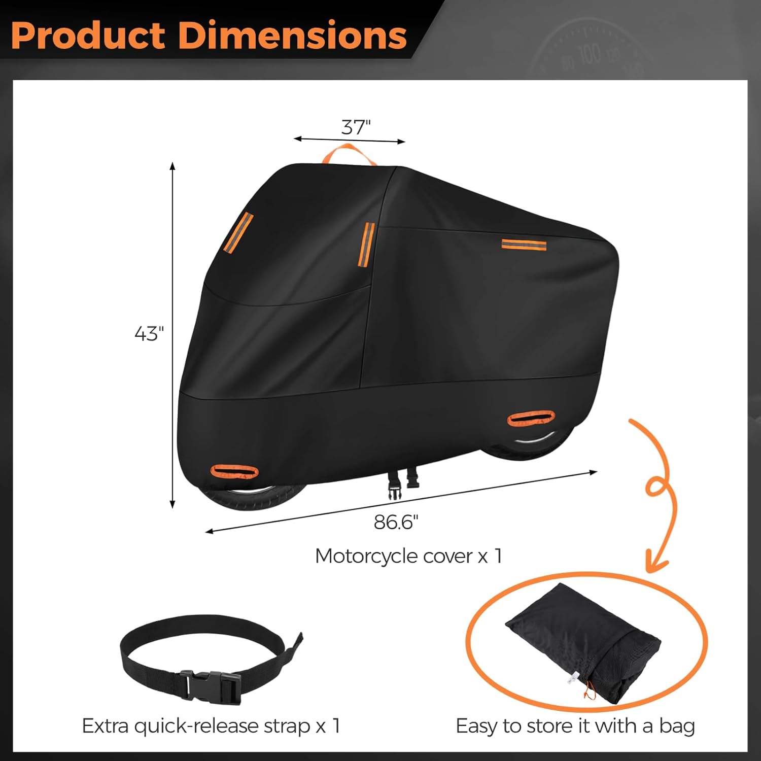 【Waterproof 300D Oxford Fabric】Crafted with durable 300D Oxford fabric with reinforced double-stitched seams, makes it waterproof and offers comprehensive protection in rainy, snowy, and windy conditions, perfect solution for keeping your motorcycle safe and sound in all weather conditions.