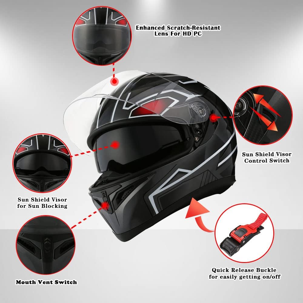 1Storm Motorcycle Street Bike Dual Visor/Sun Visor Full Face Helmet Element Silver Matt Black: HJK316