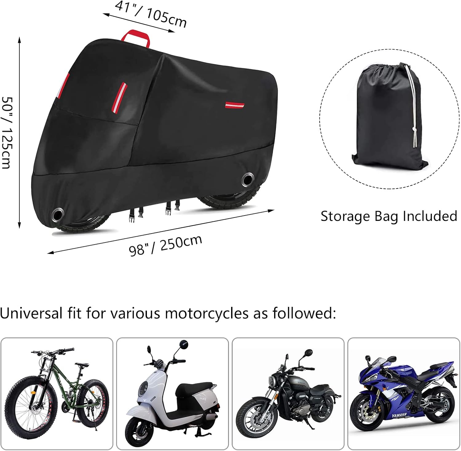 300D Upgraded Heavy Duty Motorcycle Cover, All Season Waterproof Outdoor Protection Scooter Cover with 2 Lock-Holes and 4 Reflective Strips Fits up to 98″ Honda Yamaha Harley Suzuki Kawasaki (XXL)