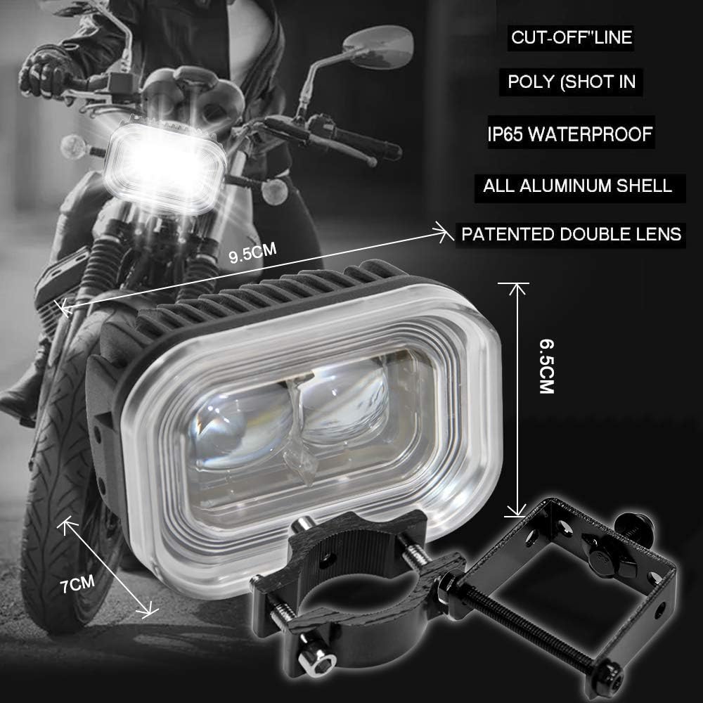 Perfect Design of Motorcycle Driving Lights: Aviation aluminum shell body with Double Lens more durable, effectively extend the lifespan of the light over 30,000 hours.Waterproof IP65 and anti-dust design can keep light working well in harsh conditions.Headlights produces brighter and farther lighting effect,Even super bright in the daytime, improving visibility at night or in bad weather.