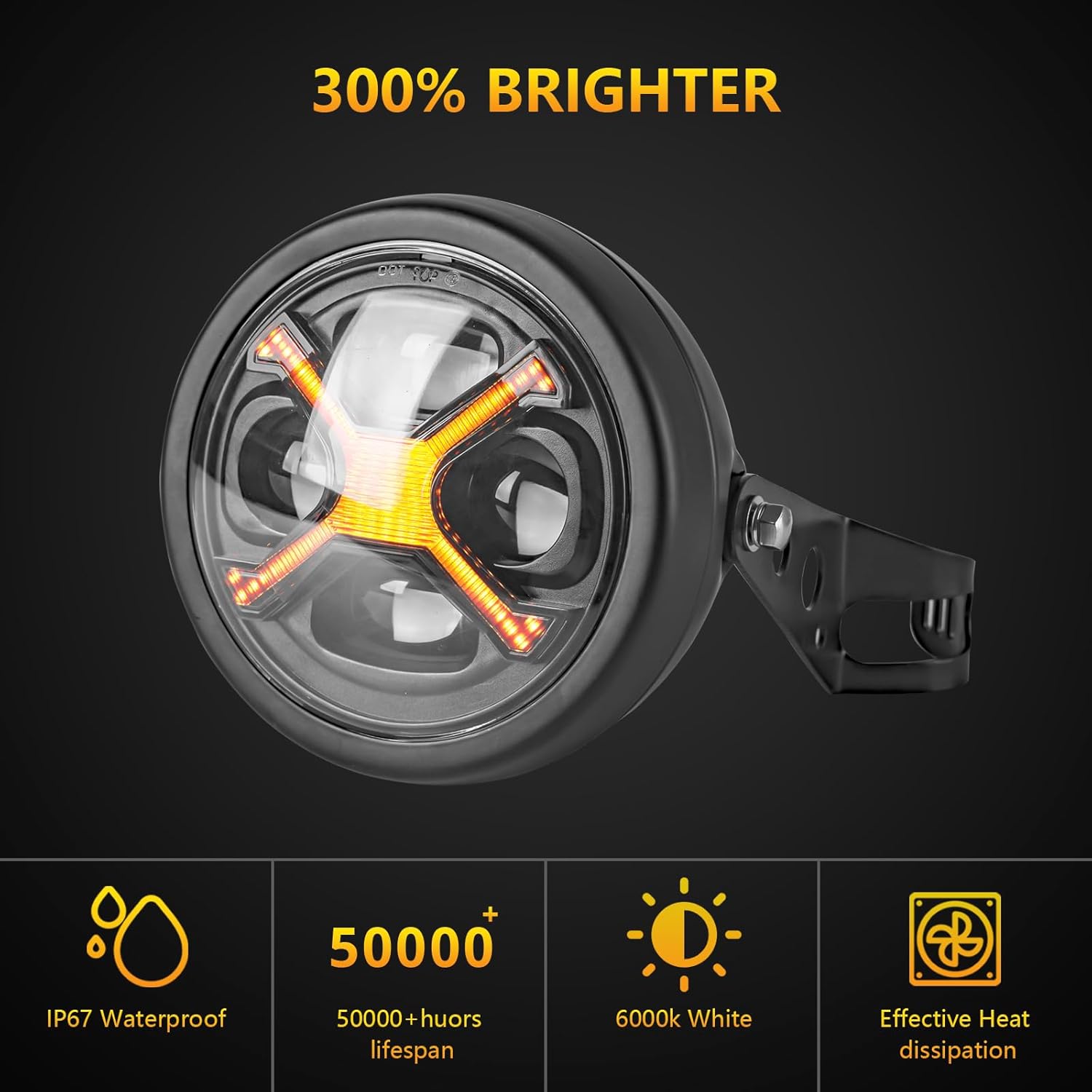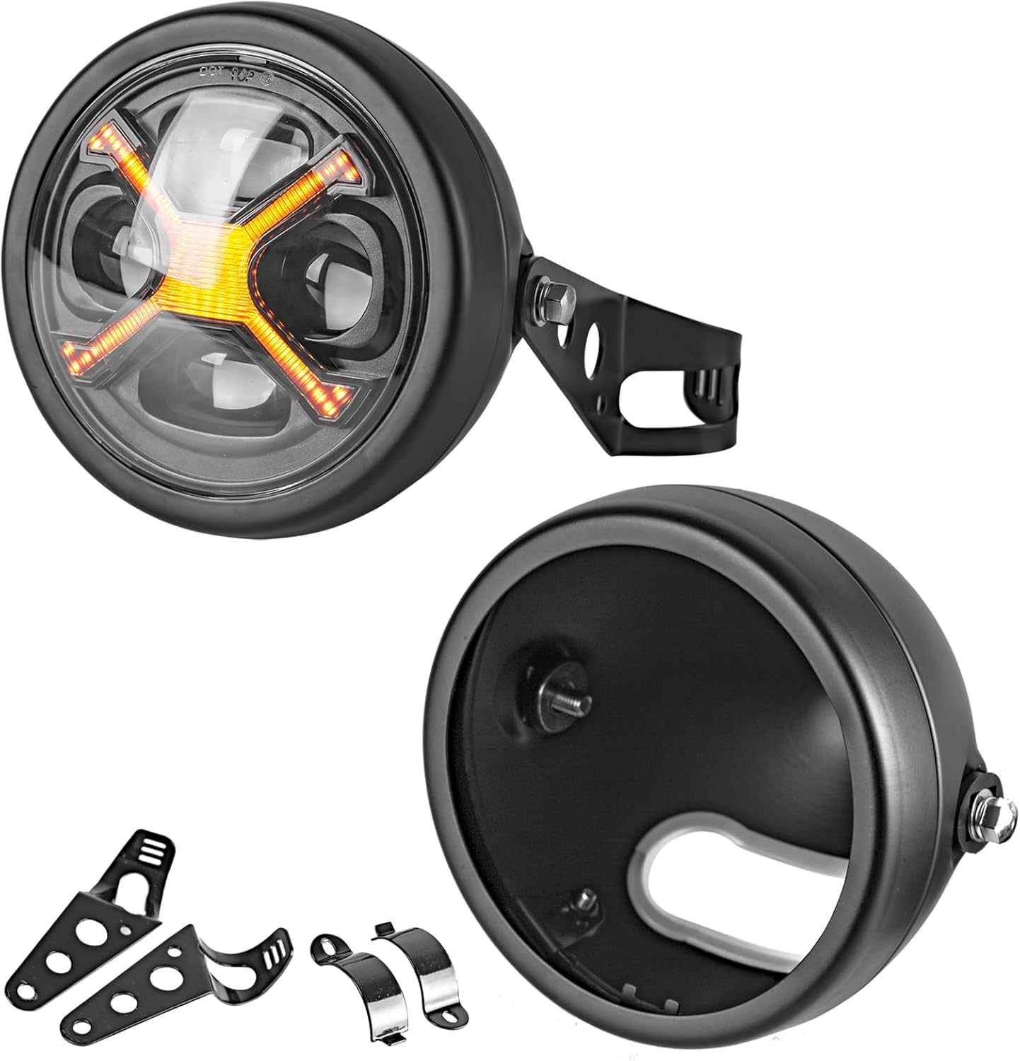 5 3/4 5.75 Inch LED Motorcycle Headlight with Headlight Housing & Bracket Amber DRL For Motorcycle Compatible with Kawasaki Shadow for Suzuki Motorbikes Metric bikes Cruiser