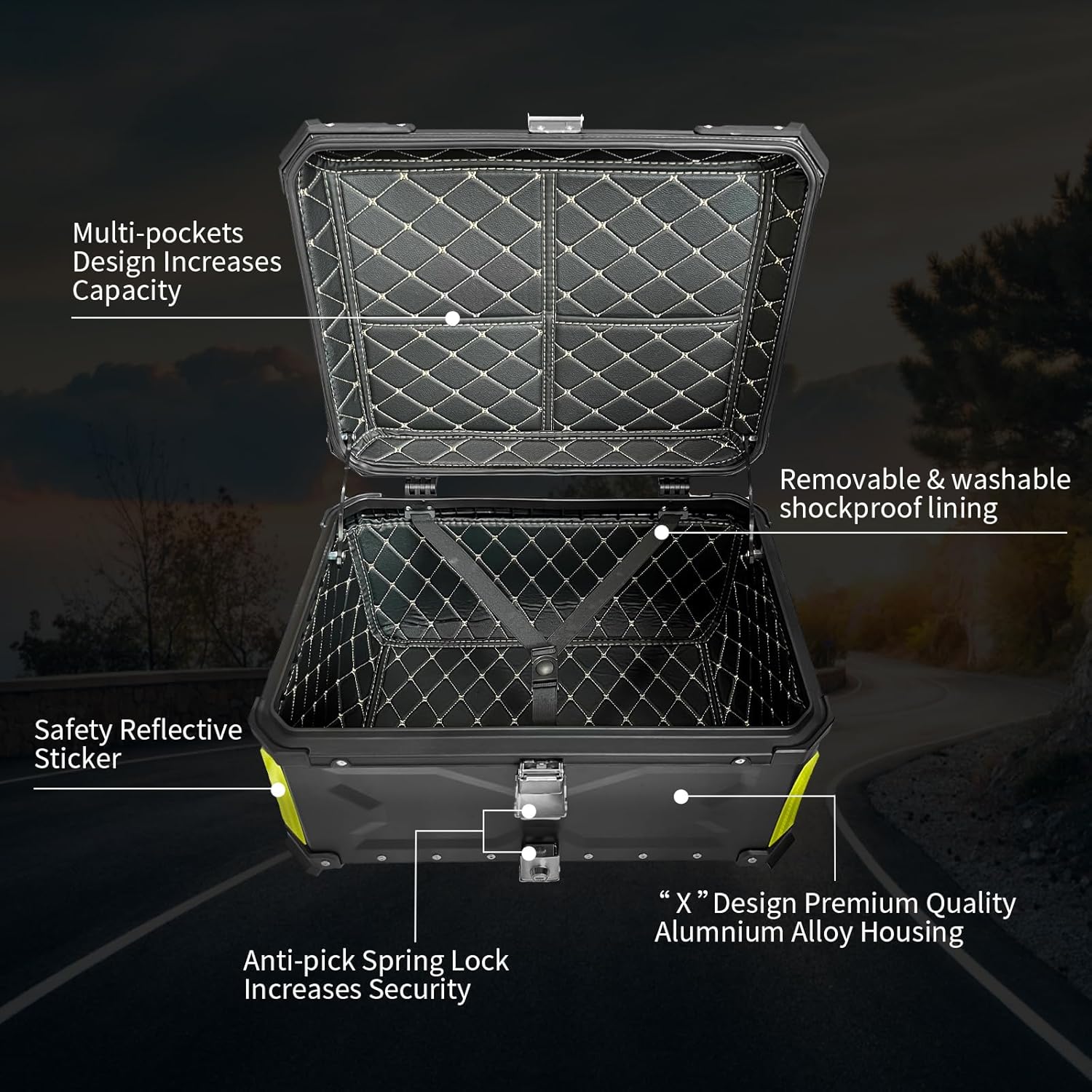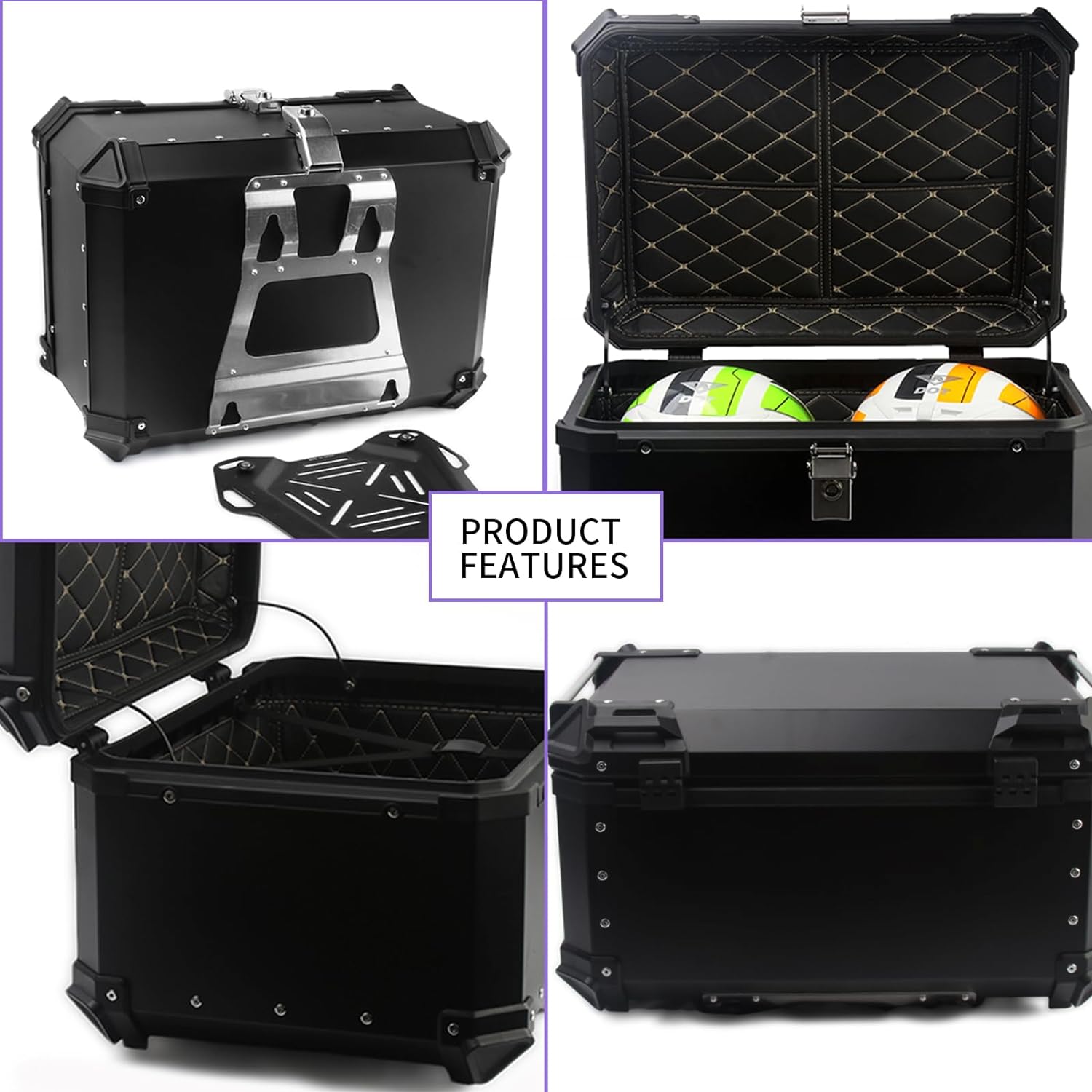 65L Motorcycle Top Case, Universal Aluminum motorcycle Tail Box with Security Lock motorcycle trunk box with Back Cushion Waterproof Motorcycle Top Box for Helmet Luggage