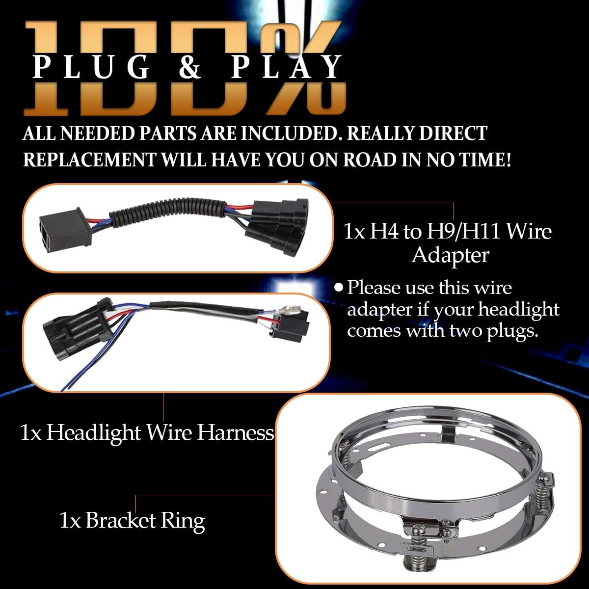 Plug-N-Play Light Kit- Includes all needed parts. Switchback, Road King, Street Glide, Electra Glide and Ultra Limited needs the included bracket to fix firmly. “2014 to 2022 “Street Glide Special” and “Road King Special” needs the included H4 to H9 adapter.