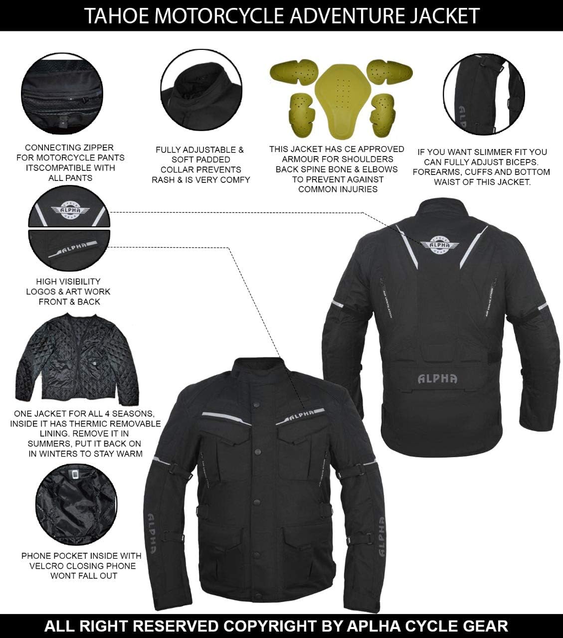 ✅AIR VENTILATION | Alpha Cycle Gear All Weather Adventure Motorcycle Jacket Got You Covered with Two Air Vents On Front and One Big Air Vent On Back. To Use This Power Sports Protective Jacket in Summers Simply Unzip the Air Vents and remove the thermal liner.