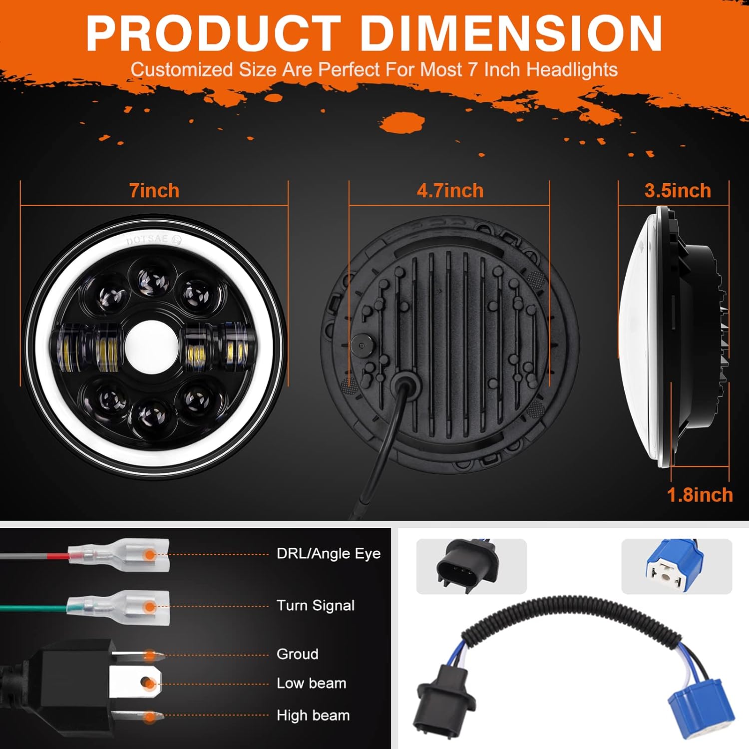 🏍【Compatibility】Length 7in,Width 3.5in. AUTOOMMO 7 inch LED headlight fits for motorcycle/vehicle which has 7 inch round light housing, such as: Harley Davidson / Street Glide / Road King / Electra Glide / Fat Boy / Heritage Softail / Ultra Limited / Ultra Classic / Switchback / Deluxe / Tri Glide / Heritage Springer / CVO / Tour Glide / Sport Glide / Heritage Classic / Softail Slim / Street Rod / Freewheeler / Yamaha Road Star, V-Star 650/1100, Royal Star / some Indian / Others Motorcycle / Jeep Wrangler JK,LJ,TJ,CJ. Please determine the size of your vehicle’s light housing size before purchasing.