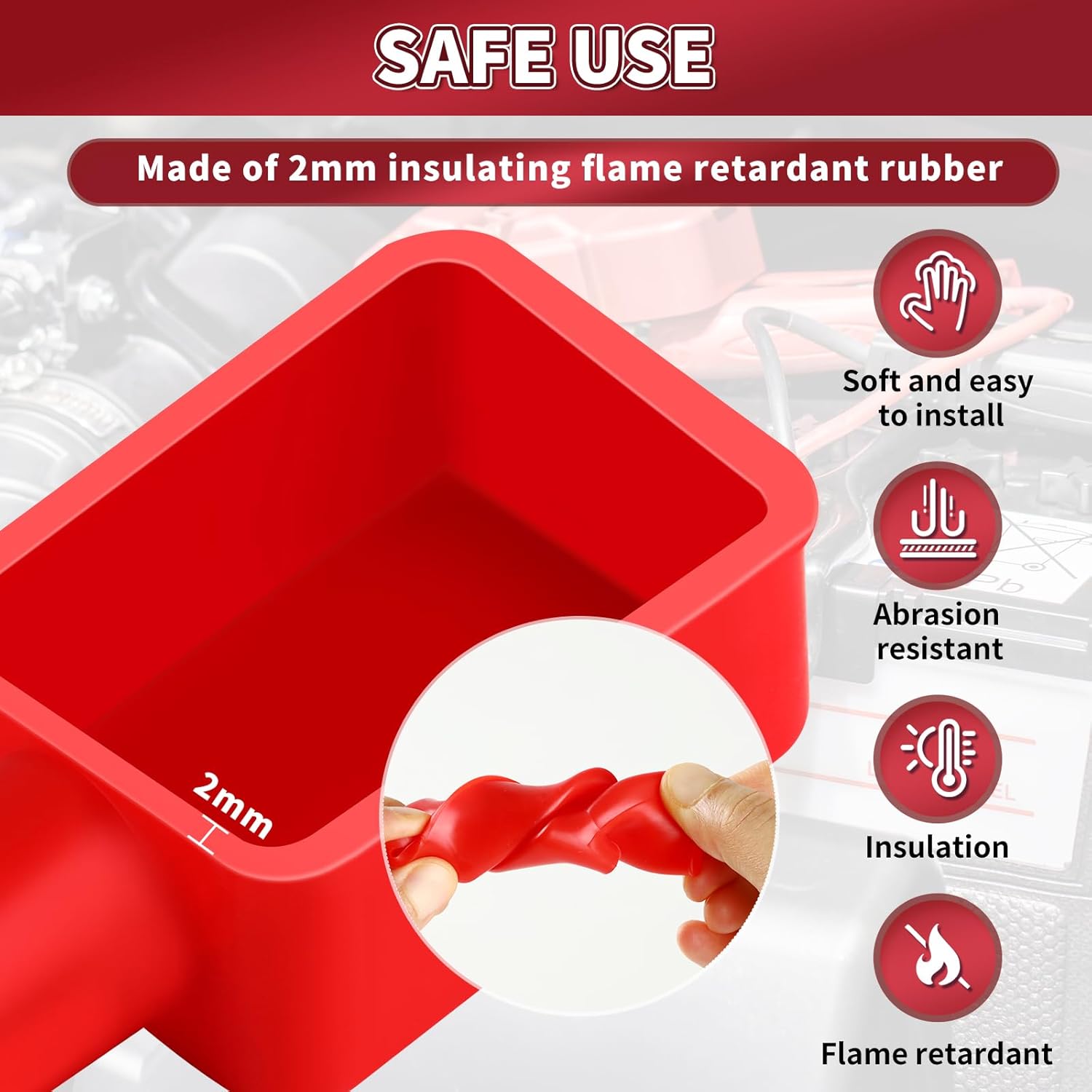 【HIGH QUALITY BATTERY PROTECTOR】 The 12 volt car battery covers is made of 2-3mm insulating flame retardant rubber, soft and good for mounting, with high strength and abrasion resistance. Battery terminal cap covers is insulating and flame retardant to ensure the safety of use.