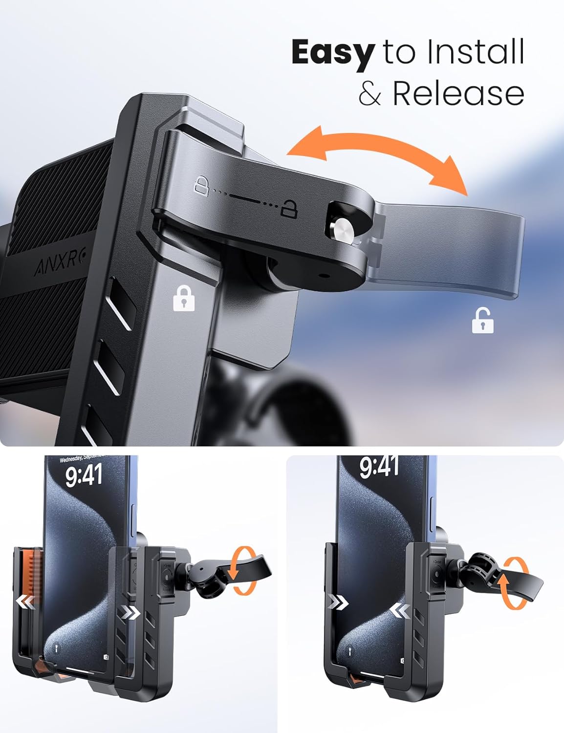 【1s One-Hand Lock & Release】ANXRE focus is not only building quality bike phone holder but also with the user safety and ease in mind, so we’ve designed high-speed secure lock. The secure lock of handlebar phone holder makes installation a breeze! Only adjust the phone clip of road bike phone mount width by rotating the lock, put your phone and close the lock to grip your phone firmly. Quickly release your phone with just a quick tug ofiphone holder for motorcycle.