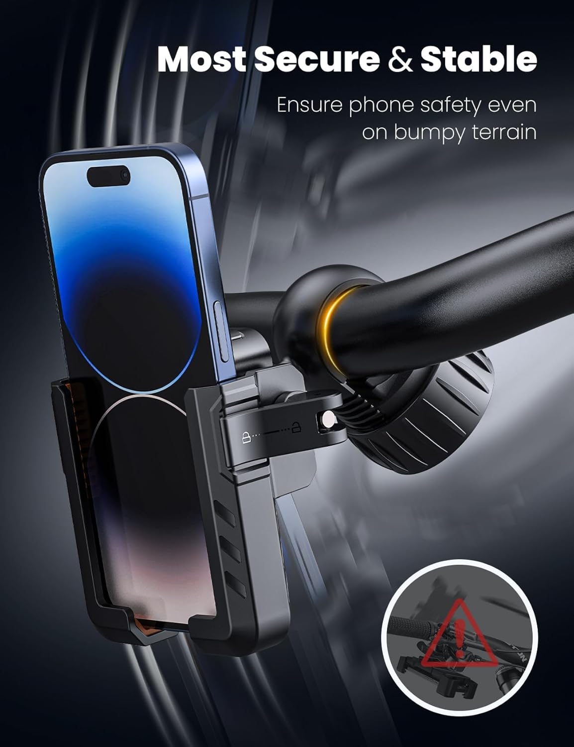 【Triple Phone Protection】Made of high quality alloy and composite plastics, the bike motorcycle phone mount is reliable for long-term choice!❶2 corners and back panel of phone holder for bike are covered with silicone that prevent scratches and has great cushion for rough roads.❷Upgraded high-speed secure lock of bike phone holder makes the bicyclist ride 80mph on bumpy road without issues.❸The joint ball of bike phone holder made of military-grade A+ material that won’t break easily.