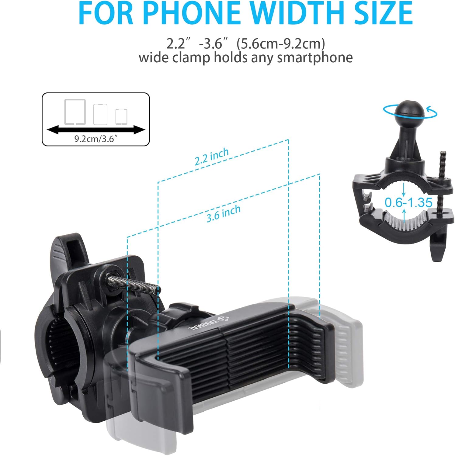 【Adjustable Clamp to Hold the Phone】Clamp of the road bike mount could fit any smartphone which wide from 2.2 to 3.6 in (5.6-9.2 cm). The material of clamp is anti-slip, and the width of it is adjustable. It will hold your phone steady and tight without scratching and protect your phone dropping.