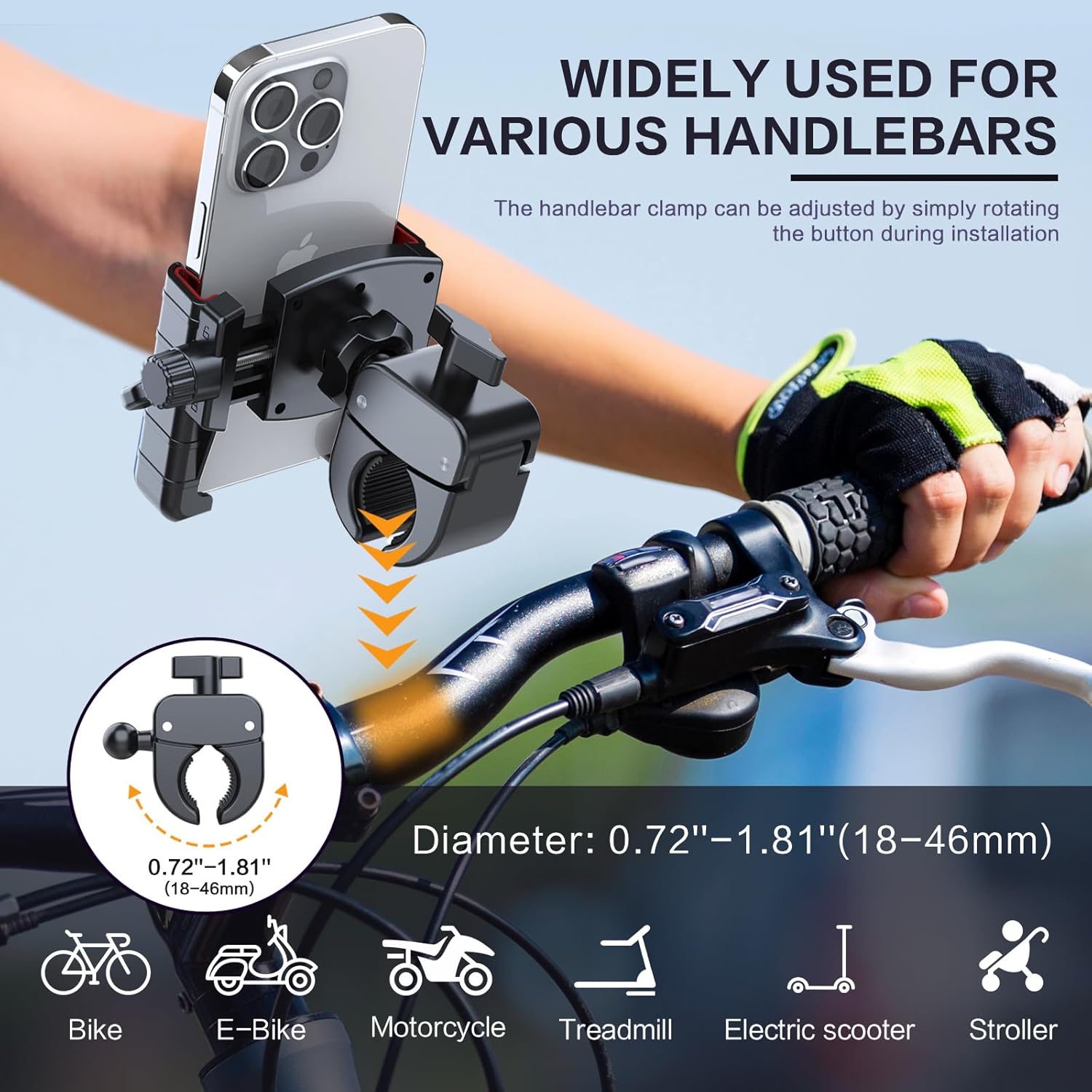 【Versatile Phone Mount】The motorcycle phone mount clamp can be used on various equipment, including bikes, motorcycles, baby strollers, electric scooters, and treadmills. The diameter is 0.72”-1.81” and can be rotated 360° for optimal visibility. It is a must-have for road trips!