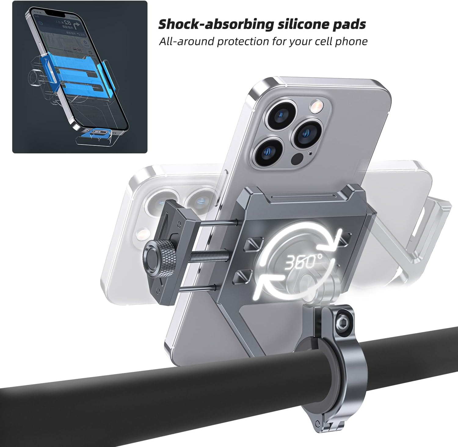 【Secure and Stable】Adjustable phone holder for motorcycle has non-slip silicone pads that prevents scratches and vibrations on your phone.keeping your phone steady on bumpy roads. Rubber protective pads on the claws can prevent scratching the phone. The metal phone mount will hold your cell phone tightly on the bicycle. Bike Mount can ensure that your phone will not loose or slip under the most dangerous conditions.