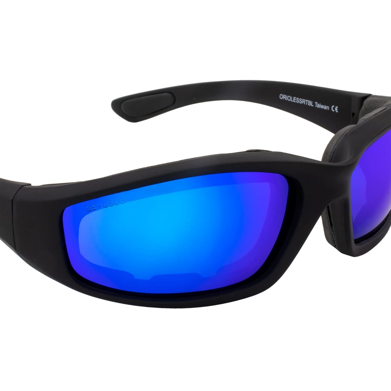 Birdz Oriole SS Padded Motorcycle Riding Sunglasses for Men or Women Anti fog ANSI Z87.1+ Black Frame w/Blue Mirror Lens