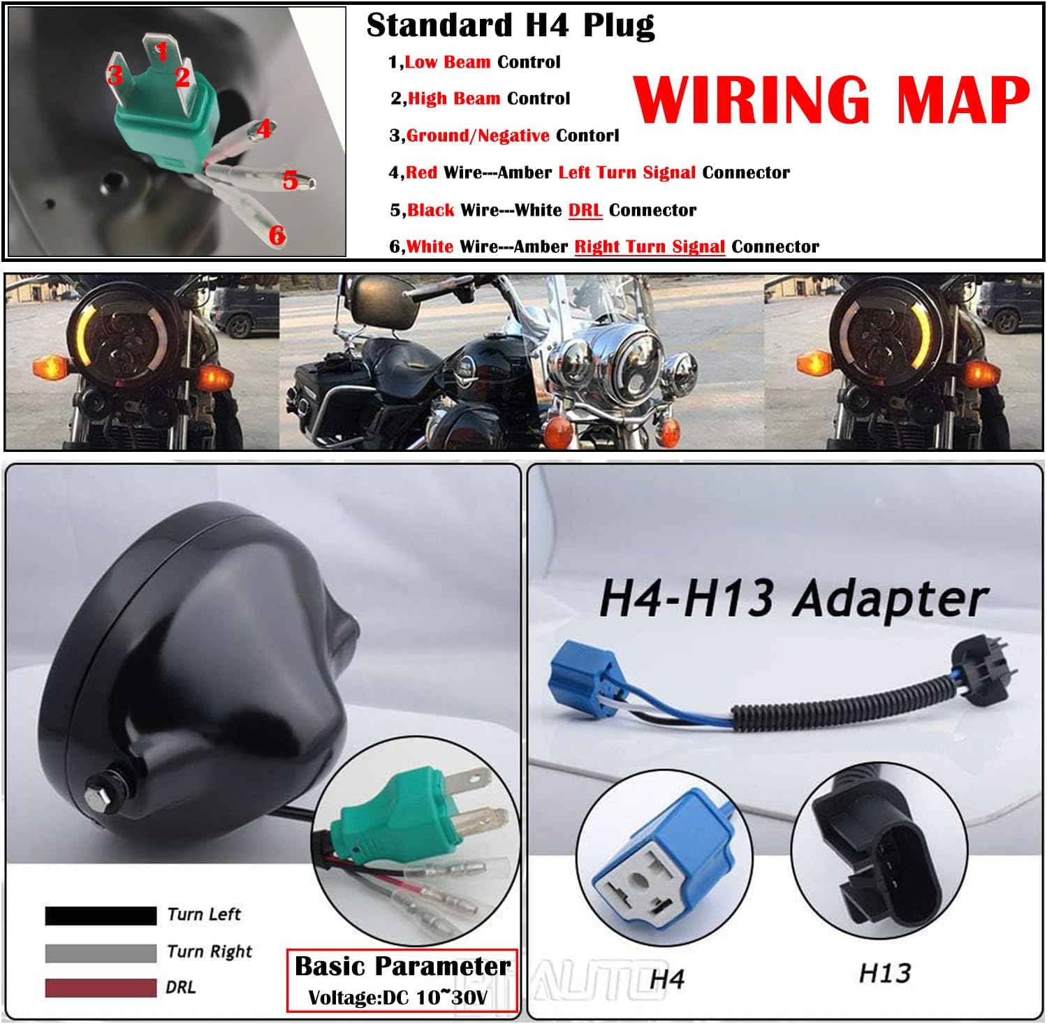 【Upgrade】Upgrade Function of 7 inch LED Motorcycle Headlight,Build with White DRL,Amber Left/Right Turn Signal,High Low Beam Function.7″ Round Motorcycle Headlight Carried 5Pcs 10W Cree High Intensity LED Chips,30W/4000LM for High,20W/2800LM for Low.The Bright 6000K White Daylight Effect,Improved for Night-time Visibility,See Clearly,More Comfortable For Driver Eyes.Noticeable Amber Turn Signal,More Safer on Road.DOT,SEA Approved,Won’t Blind Oncoming Traffic.Enjoy a Safer Driving Experience.