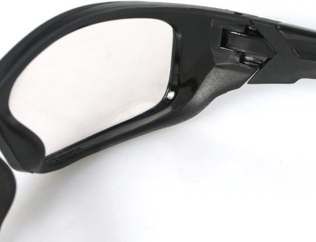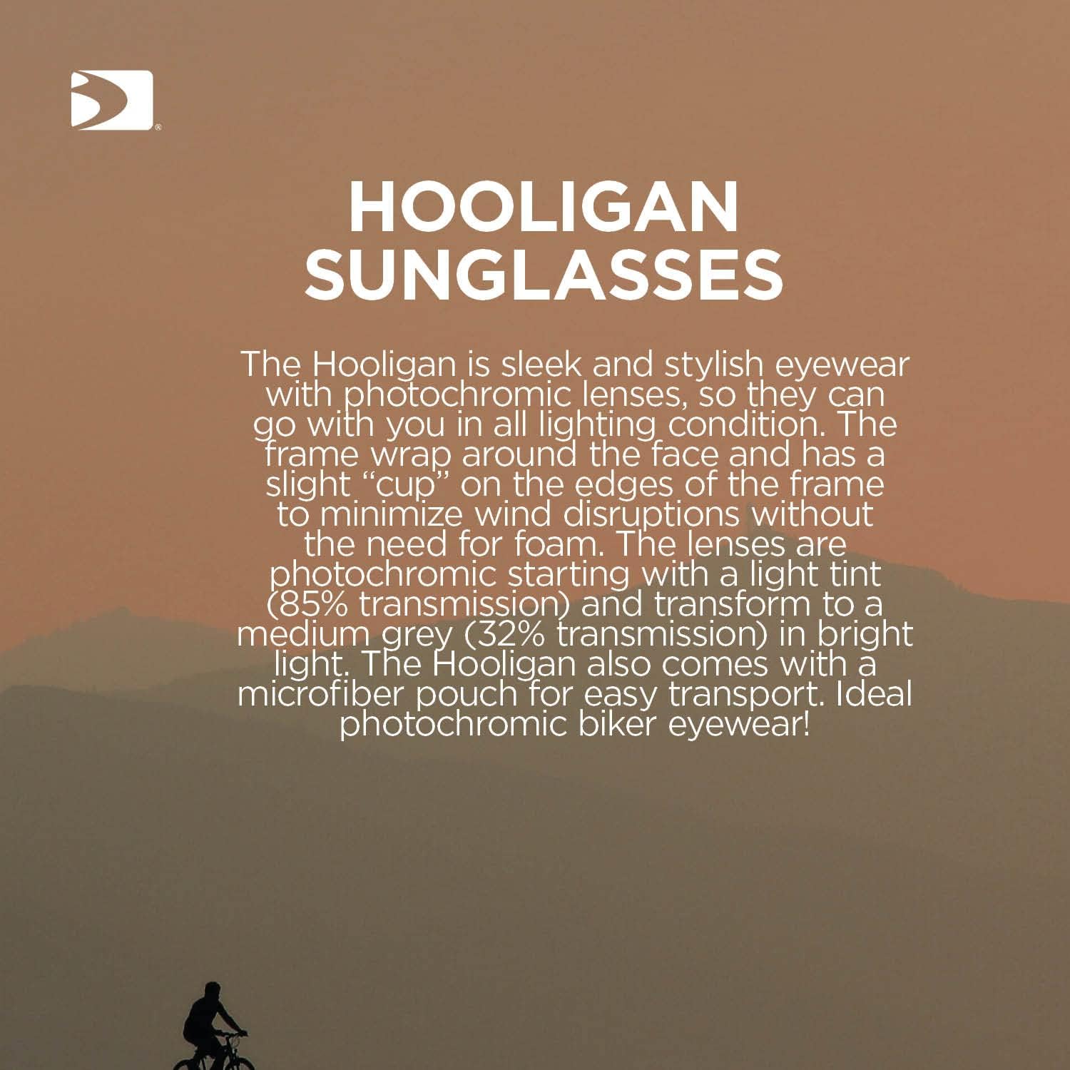 The Hooligan is sleek and stylish eyewear with photochromic lenses, so they can go with you in all lighting condition. The frame wrap around the face and has a slight “cup” on the edges of the frame to minimize wind disruptions without the need for foam. The lenses are photochromic starting with a light tint (85% transmission) and transform to a medium grey (32% transmission) in bright light. The Hooligan also comes with a microfiber pouch for easy transport. Ideal photochromic biker eyewear!