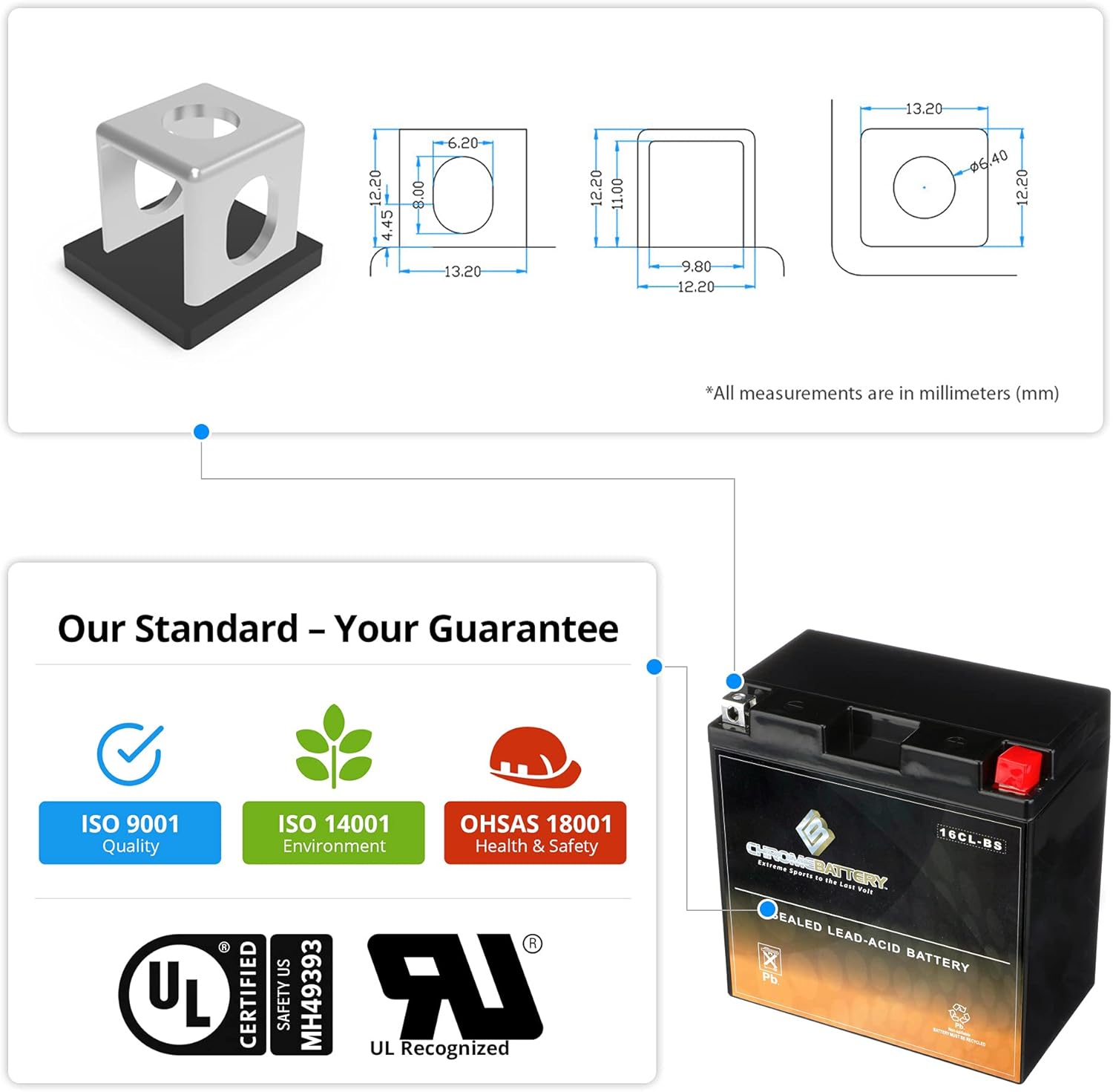 YB16CL-BS sealed AGM batteries by Chrome Battery are constructed with lead calcium alloy and absorbed glass mat technology that allows for a completely maintenance-free and high-performance operation.