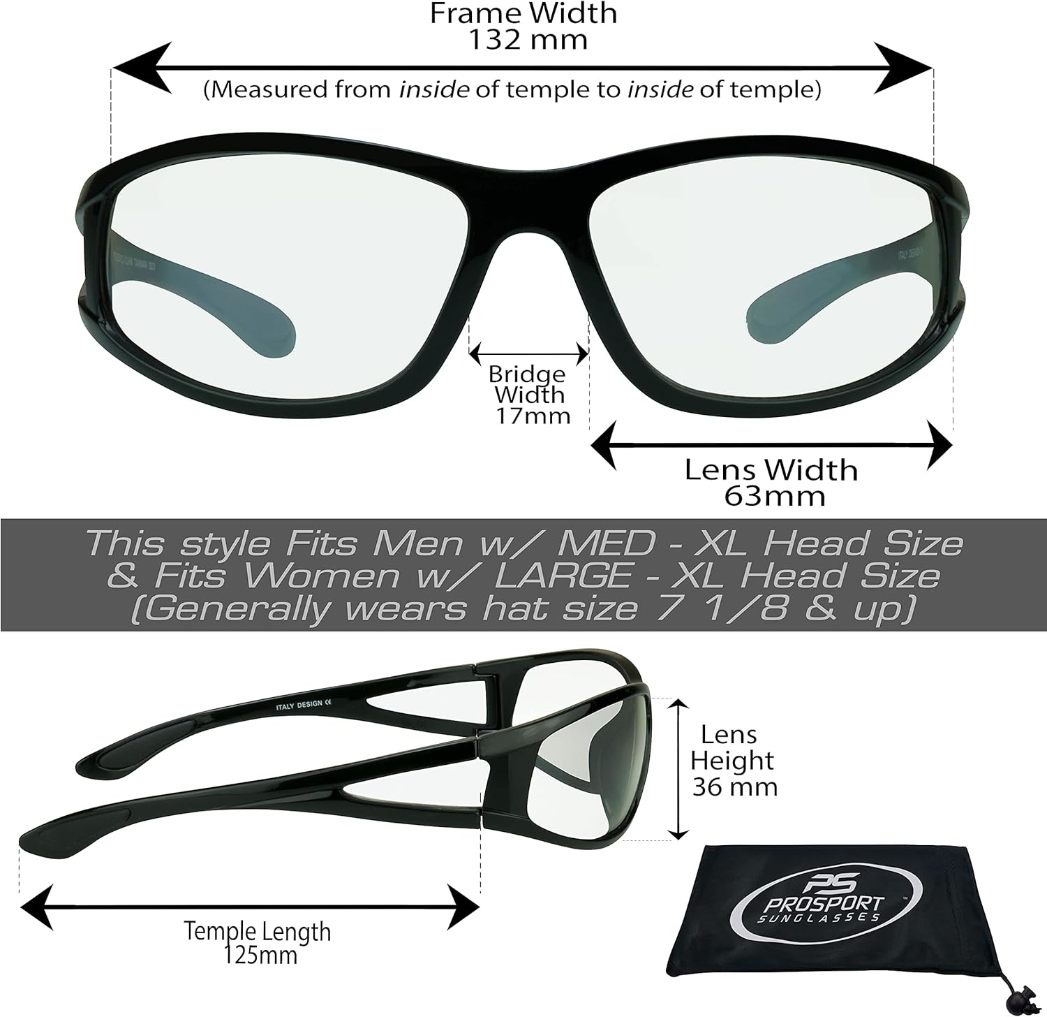Clear lens sports sunglasses are constructed of Impact Resistant polycarbonate Lenses. Perfect full wraparound frames with side shields block out wind, dust and debris from all direction. They are popular for all sports activities including cycling, running, motorcycle riding, shooting and hunting. Fits Medium to Large Head sizes.