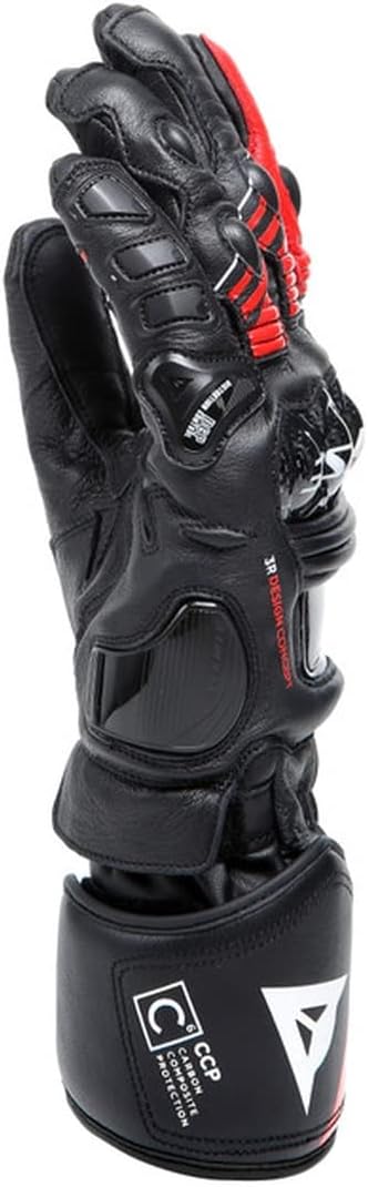 The Dainese Druid 4 leather racing gloves are an expression of the highest protection standards, designed for maximum performance on the track and the road. World Championship safety and ergonomics are guaranteed by the presence of the pre-curved and thermoformed sleeve, the carbon inserts on the knuckles and back, and the thermoplastic protector on the little finger. They are guaranteed to be resistant owing to the polyurethane inserts on the palm and joints, while four-way stretch ensures extreme comfort and a perfect fit at all times Characteristics Cover on the tightening strap Soft inserts Ergonomics Adjustable cuff strap Elastic insert on external thumb Elasticated inserts Micro-injection reinforcement on the palm Pre-curved fingers Tightening strap Main Materials Drum-dyed goatskin leather super soft palm Micro sheep leather Reinforcement in goatskin between thumb, index and palm Sheep leather Performance Shock Composite inserts in carbon fiber on the knuckles and back DCP system on little finger Gloves certified to CE – Cat. II – EN 13594/2015 Standard cat. II lev. 1 One single leather panel to the side of the hand Polyurethane insert on the palm Polyurethane inserts on the joints of the fingers Quadruple elastication between knuckles and back of the hand Reinforced preformed cuff construction Thermoplastic resin inserts on side of little finger Temperature Perforation on inner side of finger