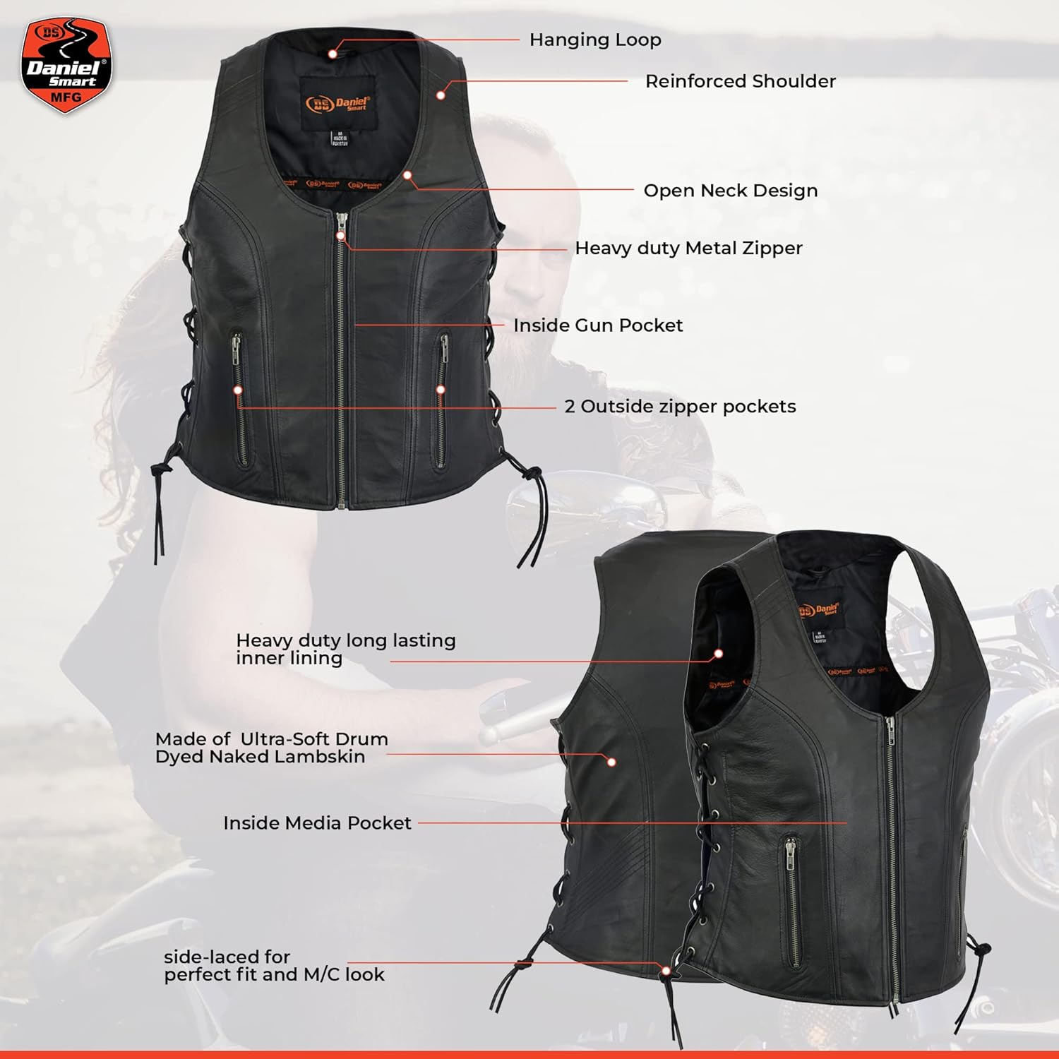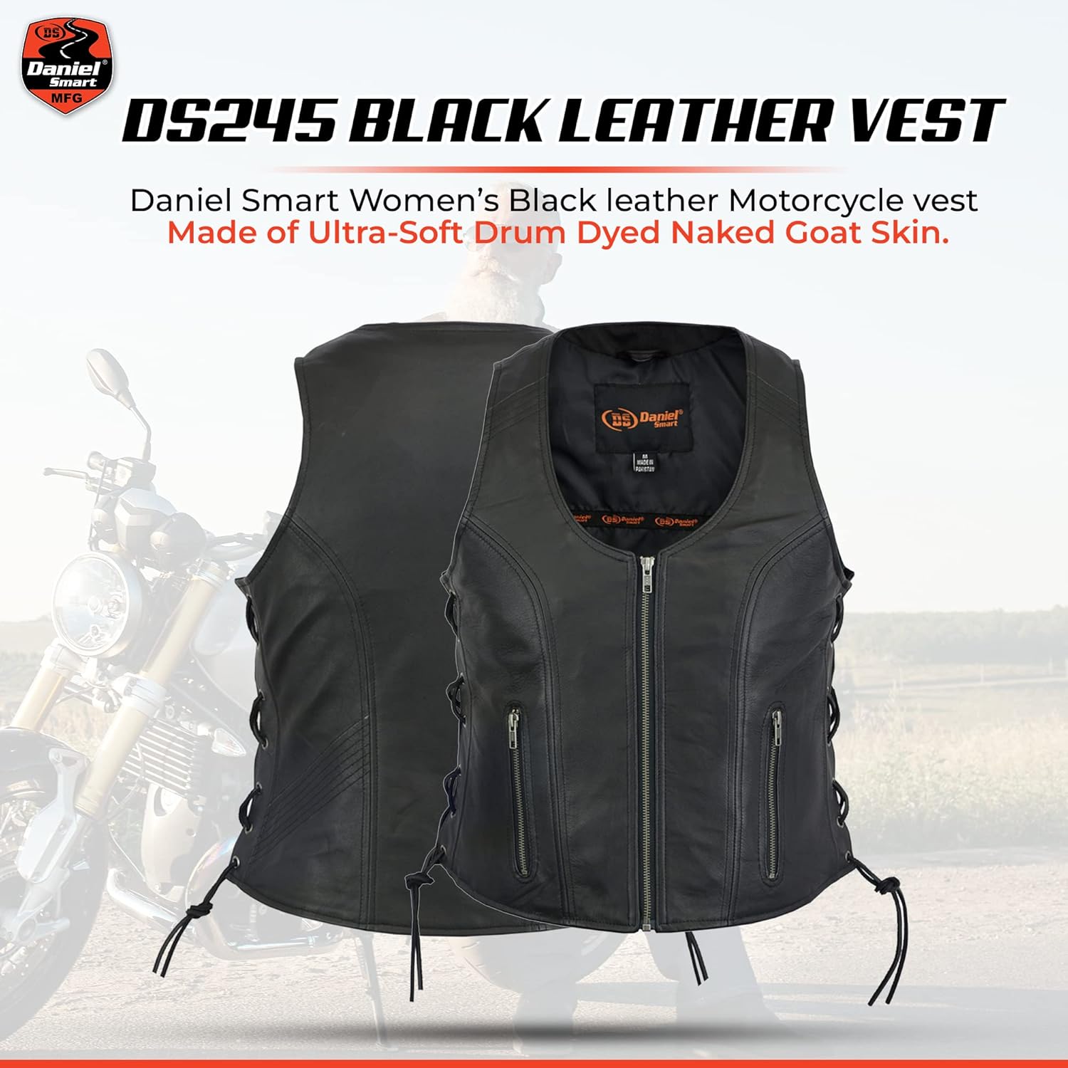 Be the first to review “Daniel Smart Women Leather Vest – Soft Goatskin Leather Vest with Front Zipper Stylish Side Laces & concealment Armory Pocket”