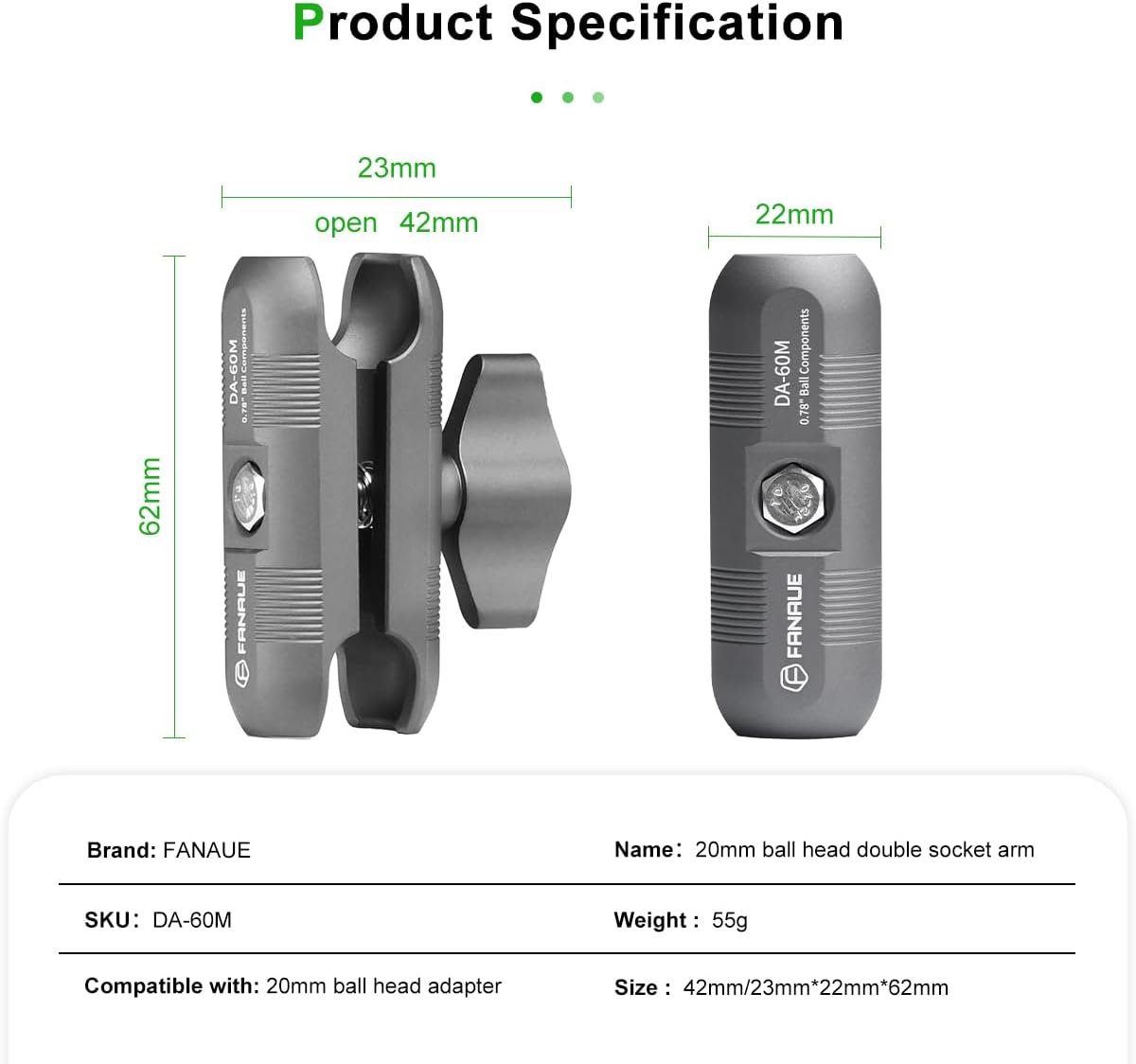 FANAUE Aluminum 20mm Ball Head Double Socket Arm Only Supports Installation of 20mm Ball Head Adapter, Connects Phone Clip and 20mm Ball Base and Can be Assembled Into Bike Motorcycle Phone Holder