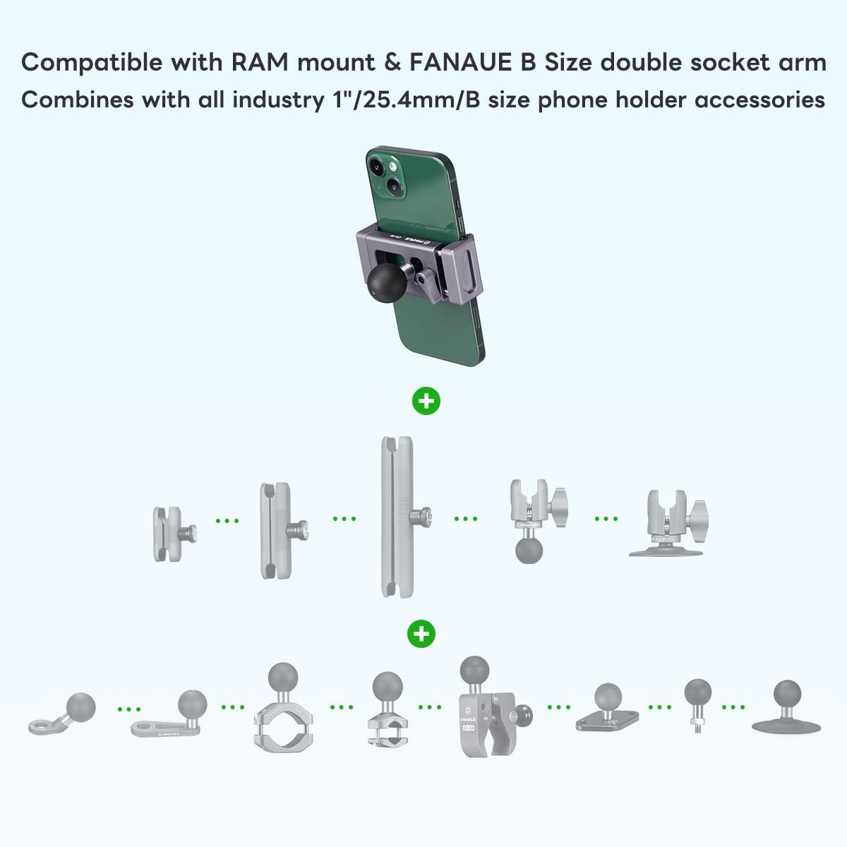 FANAUE Aluminum Phone Holder with 1″ Ball Head Adapter Compatible with RAM mounts B Size Double Socket arm & Bike Motorcycle Phone Mount for 6-8.5″ Smartphone, Anti-loosening knob Double Protection