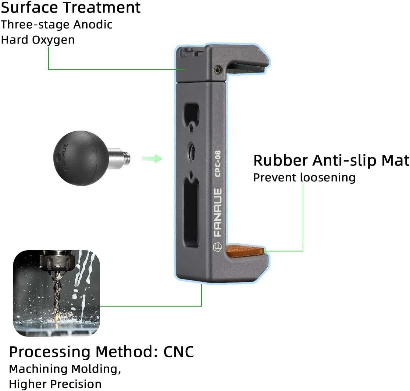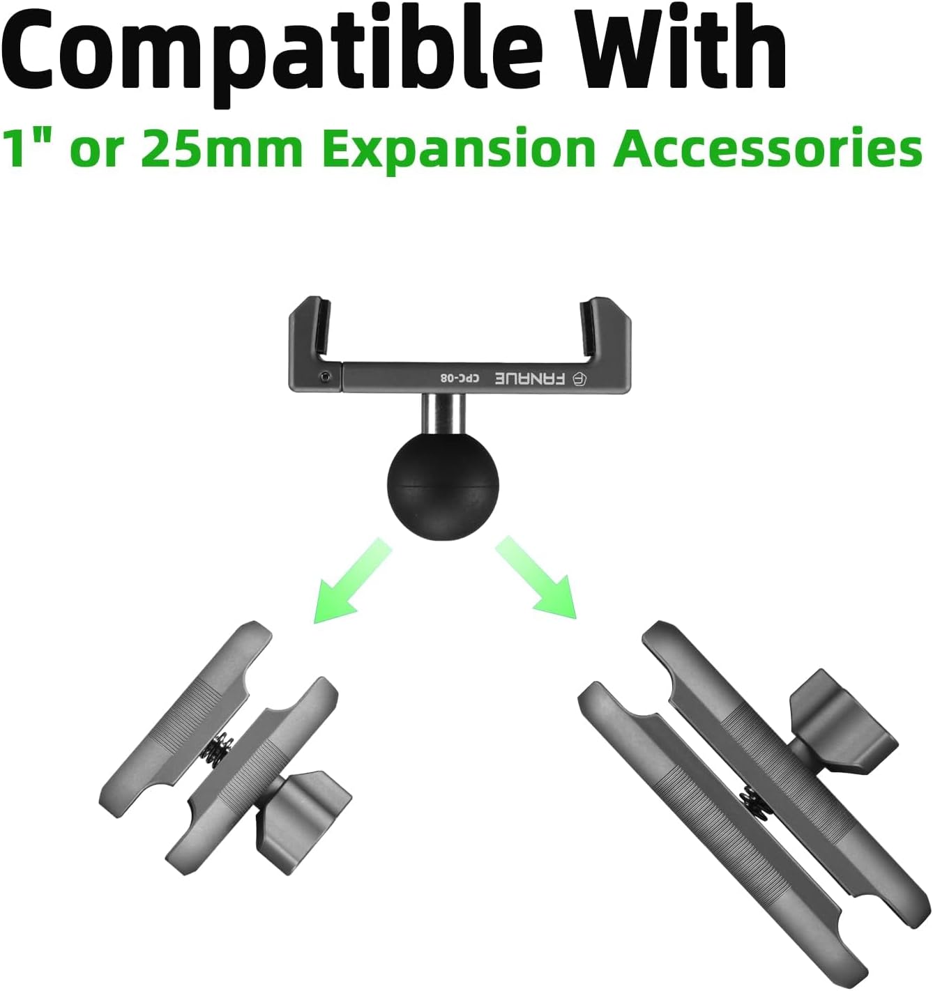 The phone holder has two 1/4 screw holes and a cold shoe , which can be used to install or connect other accessories , such as fill light , microphone , etc .The phone holder has a 1 ” Ball , which can be used with FANAUE DA-60 DA-90 Double Socket Arm for more expansion .
