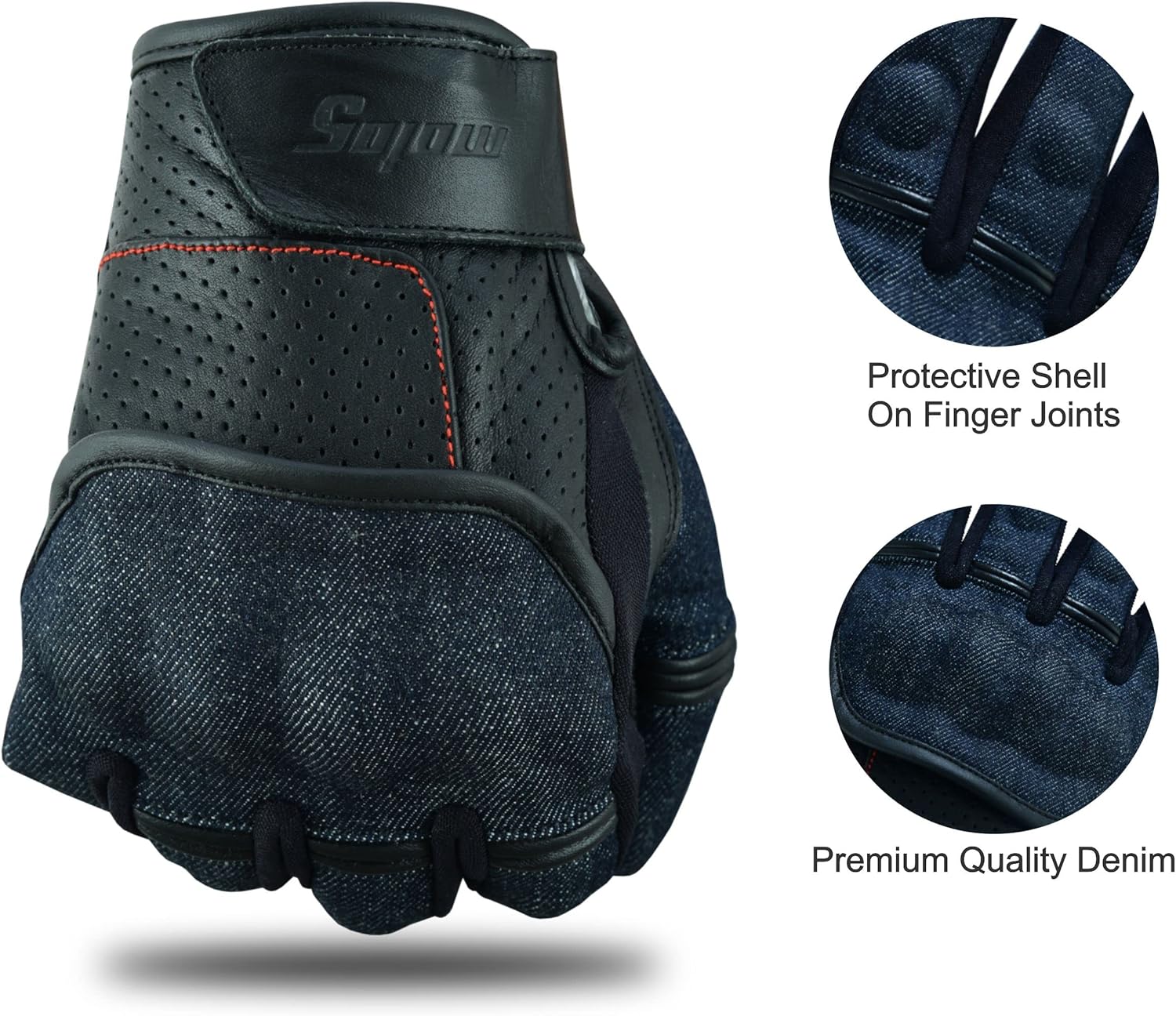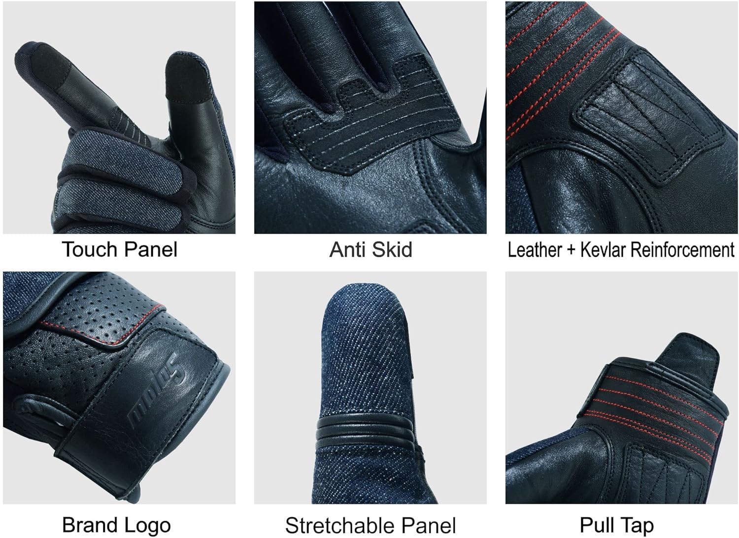 – ULTIMATE COMFORTABLE & BREATHABLE – The soft motorcycle leather gloves are comfortable to wear, and the perforated cow skin leather and denim is breathable, resists stuffiness, and can be used in all seasons.