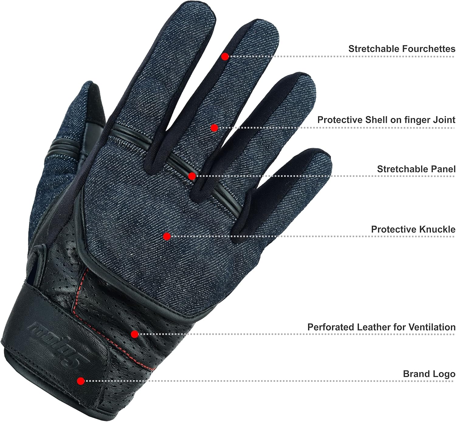 KNUCKLE AND FINGER JOINTS PROTECTION – The riding gloves has PVC metacarpal-knuckle and Finger joints protective shells, underneath the Denim dirt bike gloves for men.
