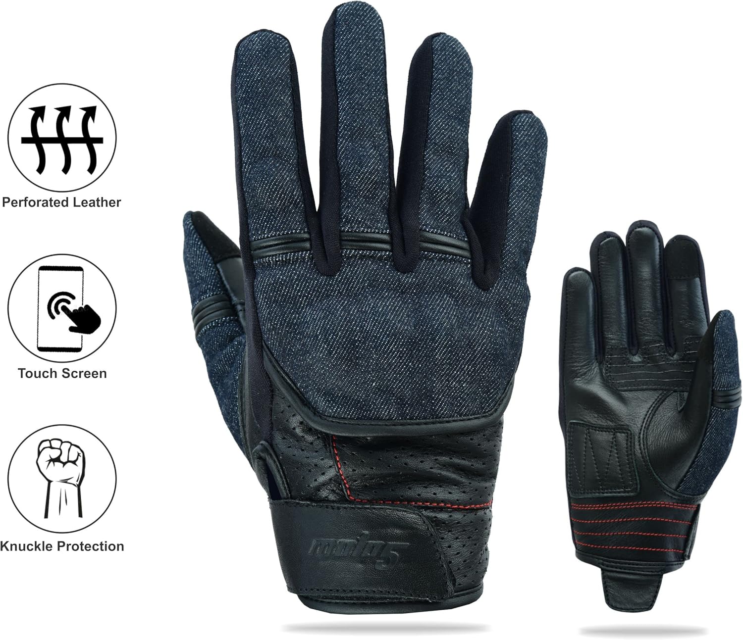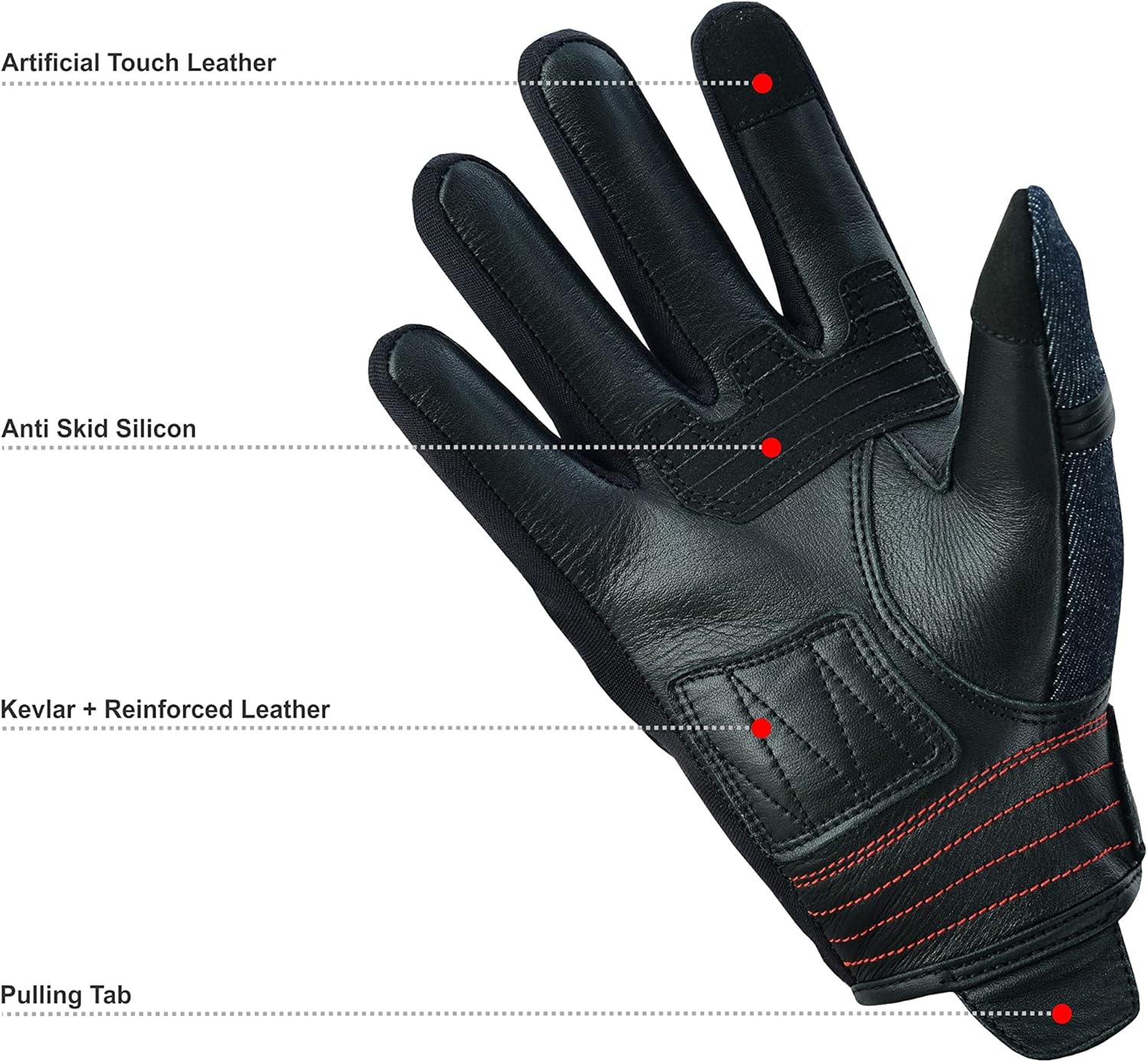 GENUINE LEATHER MOTORCYCLE GLOVES – It has Genuine Leather and Highly Abrasive Denim Outer Construction – The biker gloves for men are made from high-grade Full-Grain Cow skin Leather and Denim that ensures durability through a variety of situations.