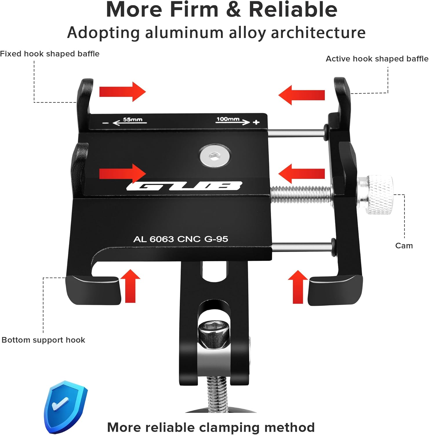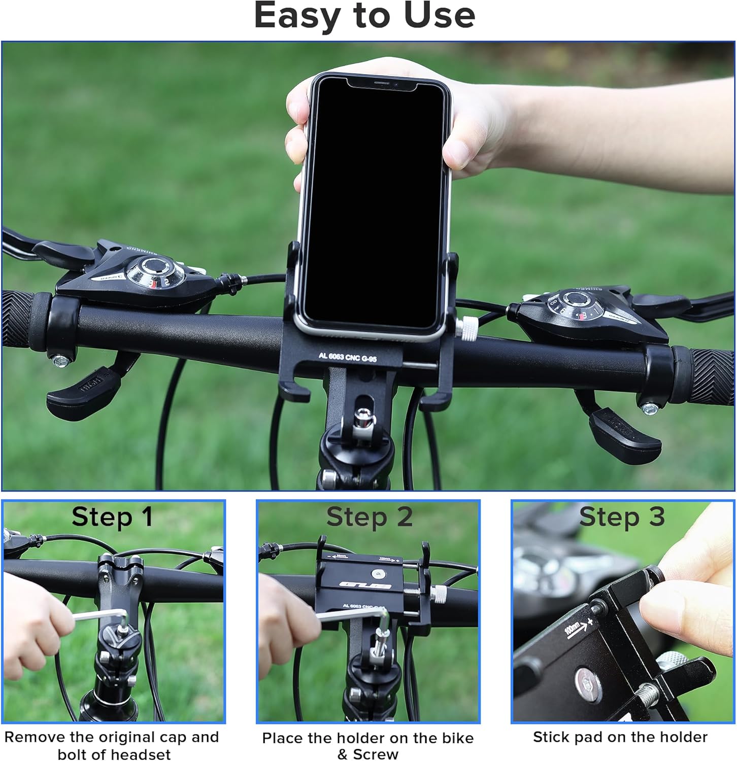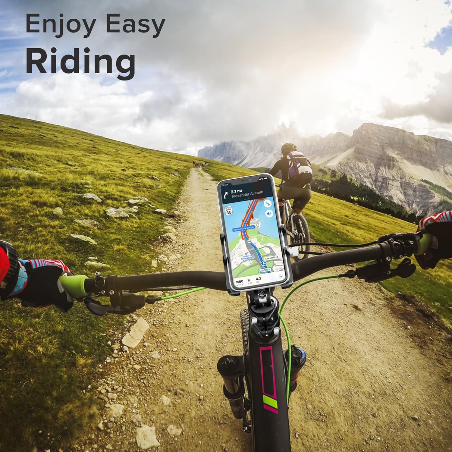 【Aluminum Alloy】Our phone mount for bicycle is made of CNC aluminum alloy, longer life. Even when you ride at 75 mph or over rough roads, the phone holder bike keeps your phone firmly in place.