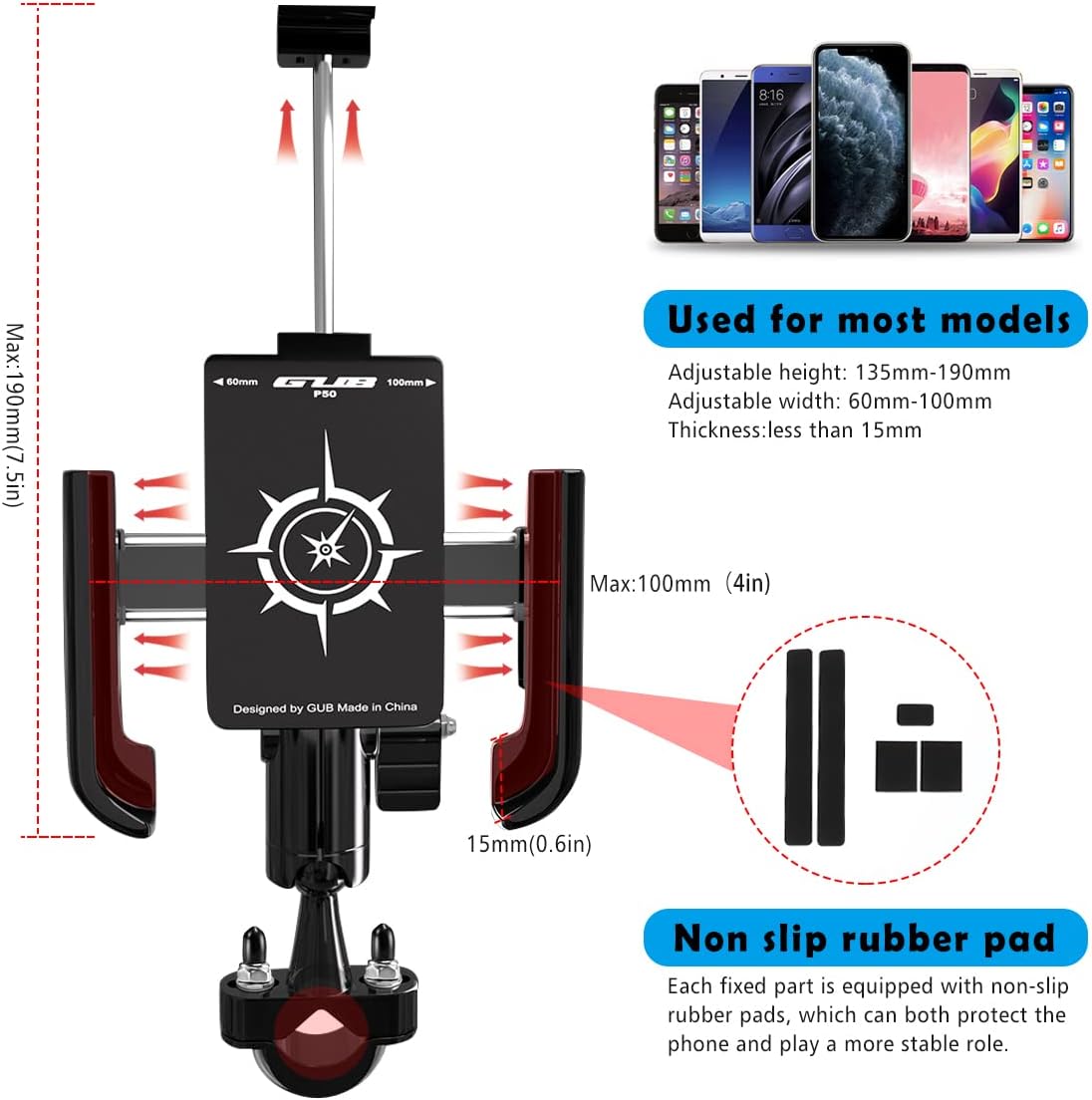 Name: GUB P50 bike phone holder motorcycle cell phone mountMaterial: Aluminum alloyColor: BlackWidth: 60mm-100mm / 2.4-4in (adjustable)Height: 135mm-190mm / 5.3-7.5in (adjustable)Suitable handlebar Diameter: 14-36mm / 0.55-1.42in (adjustable)Net Weight: 356g / 0.78lbApplication: Mountain bicycles/ road bike/ electric scooters/ motorcycles/ dirtbike/ golf cart/ moped bike/ stroller/ ATV, etc. Product Features: