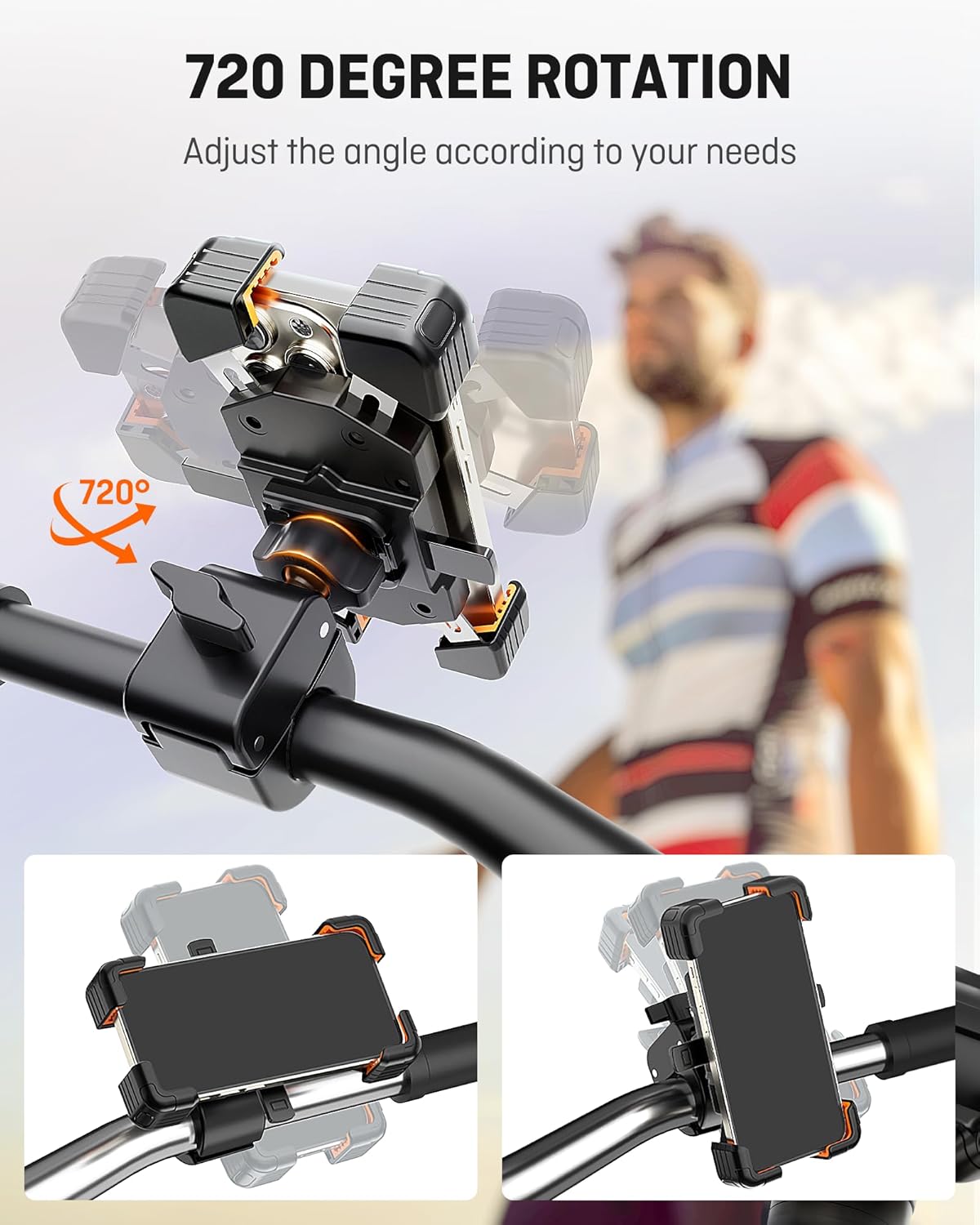 360°Adjustable:The motorcycle cell phone holder has a gimbal design, the bike cell phone holder is azimuthally adjustable, you can rotate your phone to the angle you want.