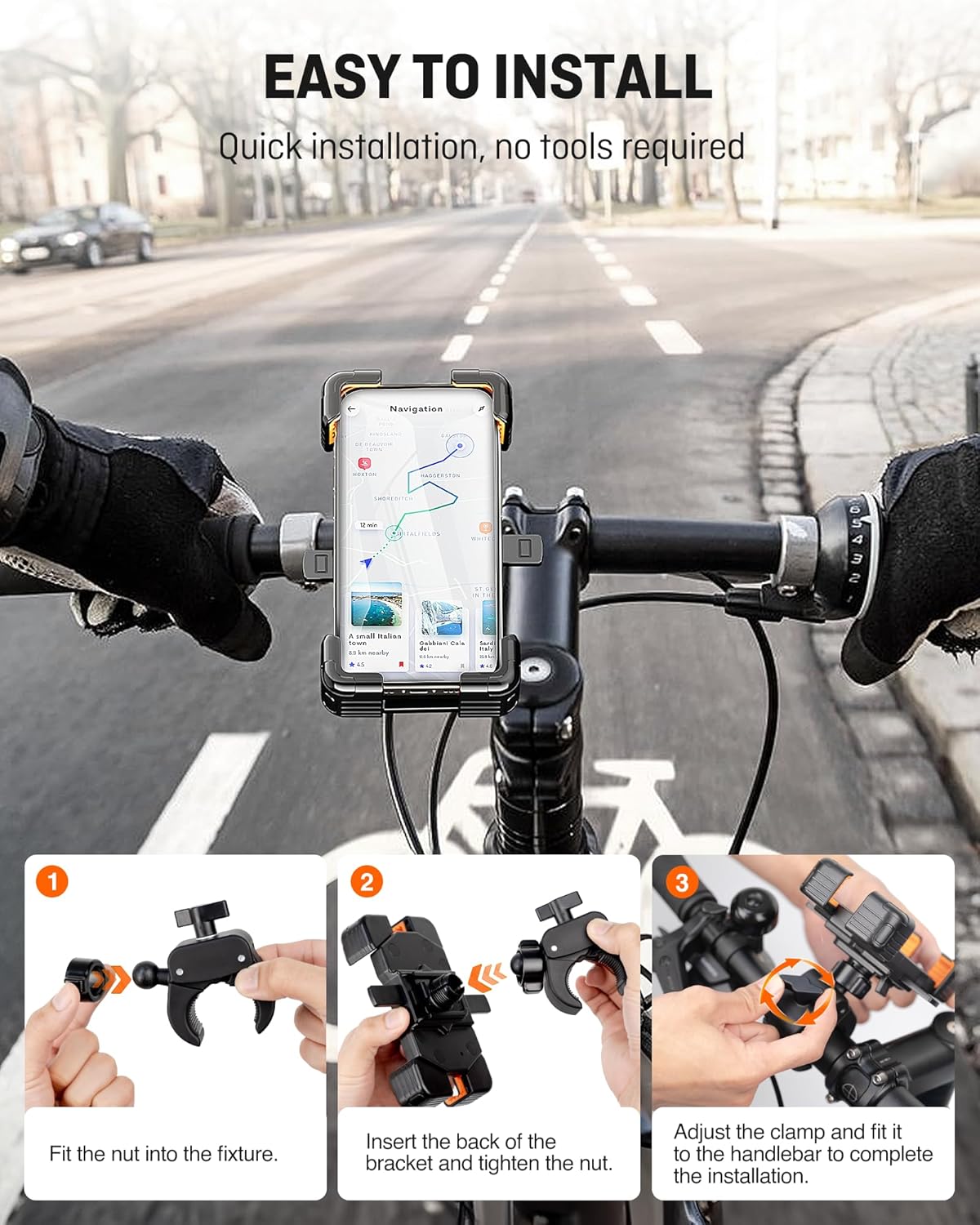 EASY INSTALLATION:Bicycle cell phone holder is compatible with handlebars from 0.73 inches to 1.54 inches Just twist the nut on the handlebar clamp to quickly adjust the handlebar clamp to fit the handlebar, no tools required. Suitable for bicycle and motorcycle handlebars, electric scooter and so on