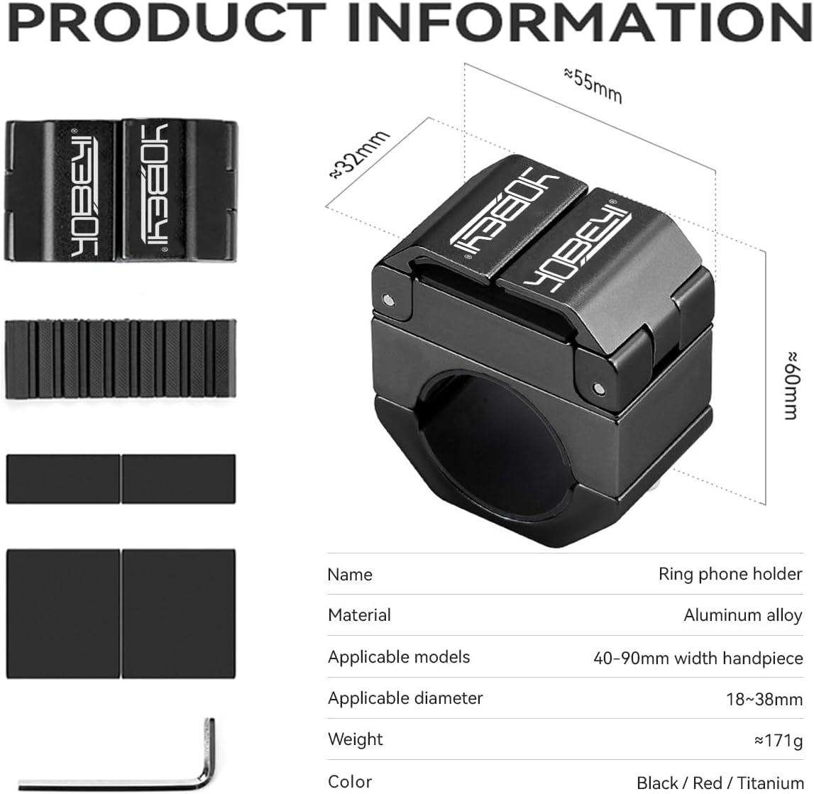 Name Ring phone holder Material Aluminum alloy Applicable models 40-90mm width handpiece Applicable diameter 18~38mm Weight ~171g Color Black/Red/Titanium