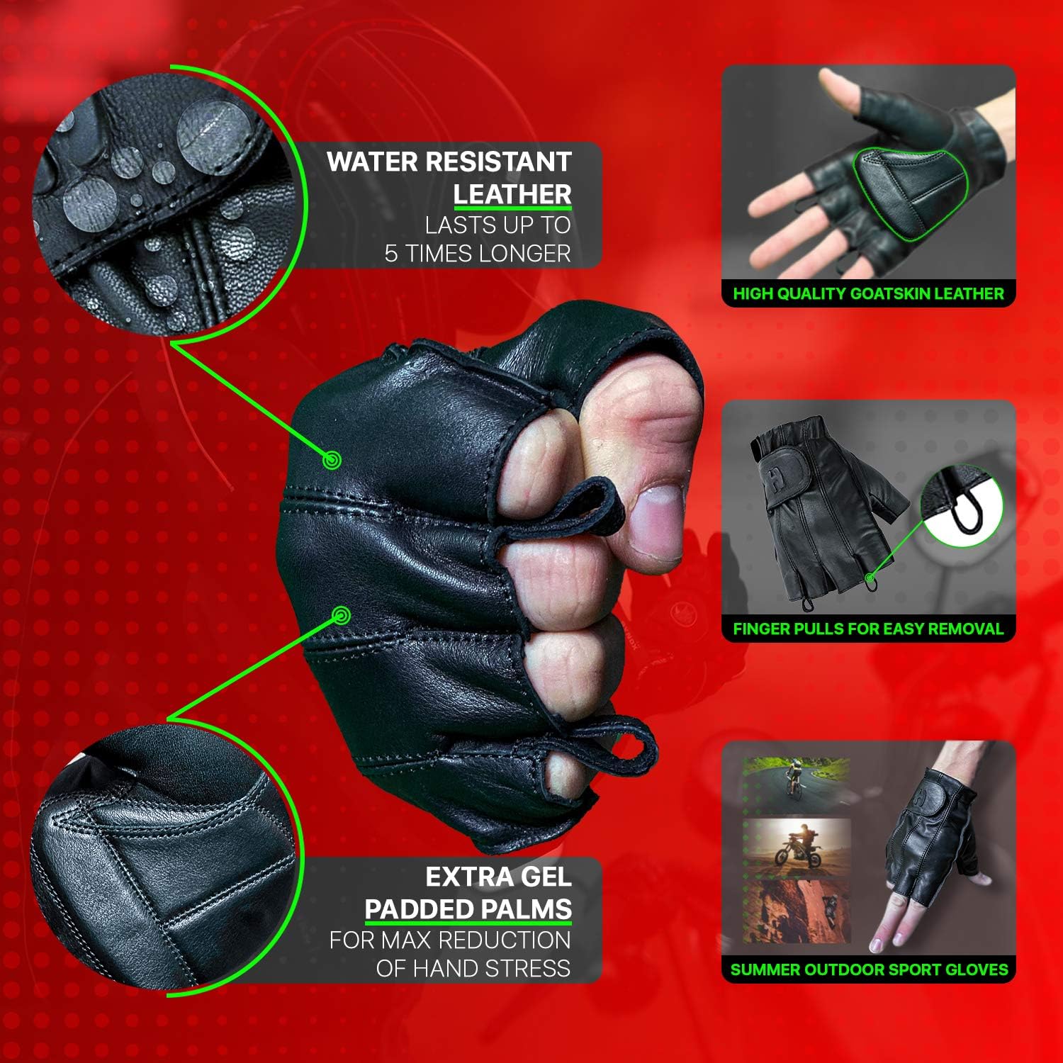 Versatile Protection for All Activities: Hugger Full Finger Fingerless Black Deer Soft Leather Gloves with Gel Padded Palms are the ultimate choice for driving, motorcycle riding and outdoor adventures. Crafted from premium deer soft leather, these Full Finger fingerless gloves provide exceptional comfort, durability, and flexibility. Whether you’re navigating the open road on a motorcycle these work gloves for men and women offer unparalleled protection and a secure grip.