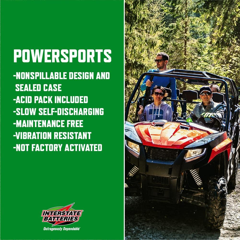 POWERSPORT FEATURES: Interstate’s rechargeable powersports battery is made with a dependable design of leakage resistant & valve regulated sealing. Our dry charged design creates long storage time that can be used at your convenience (before activating your battery). Your safety is Interstate Batteries top concern, so this maintenance-free battery is enhanced with active material & compounded to withstand vibration while prolonging battery life