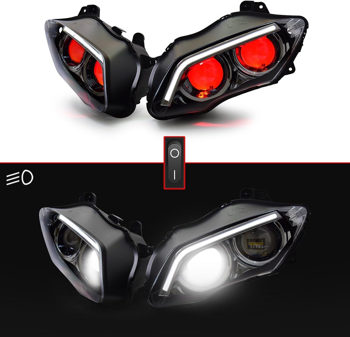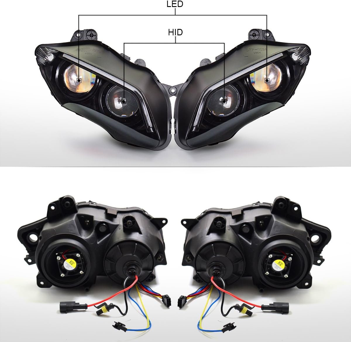 KT HID & LED Headlight Assembly for YZF R1 2007-2008, Custom Modified Motorcycle Headlight with High/Low Beam, DRL, Turn Signal and Optical Fiber (Red)