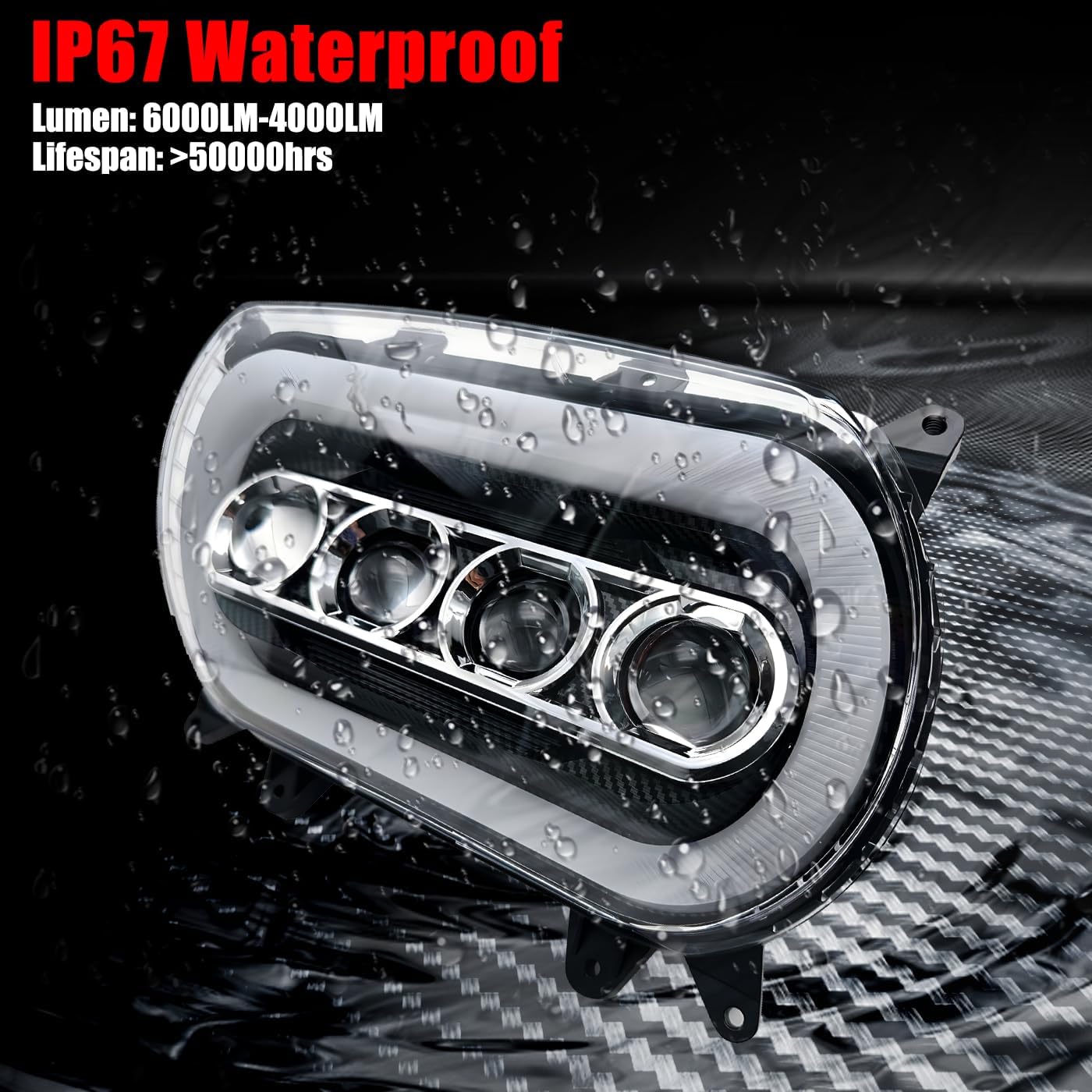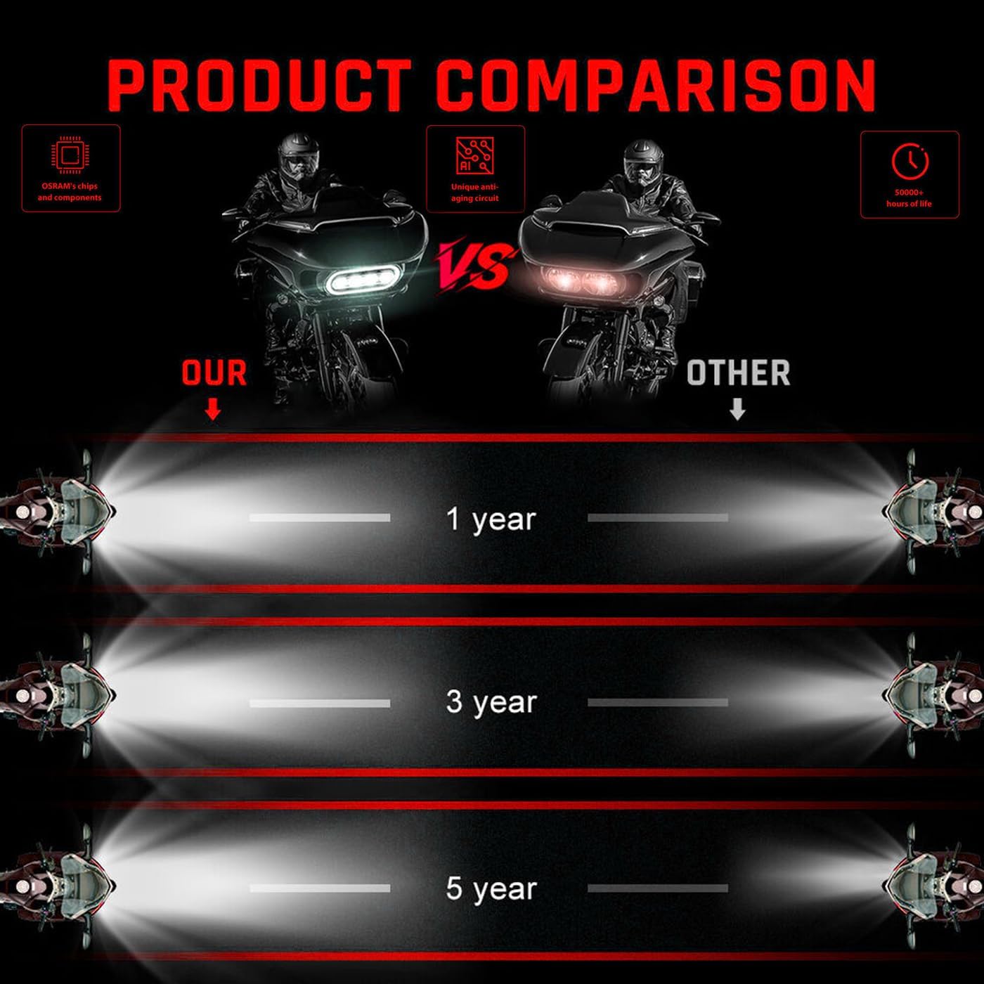 IP67 waterproof: The motorcycle headlights are made of lightweight Die-cast Aluminum with an excellent heat dissipation system. With three breathing valves, integrated design and one-way breathing valve, IP67 waterproof. All of which lay a solid foundation for the headlight to prevent water from entering, fogging, and condensation.