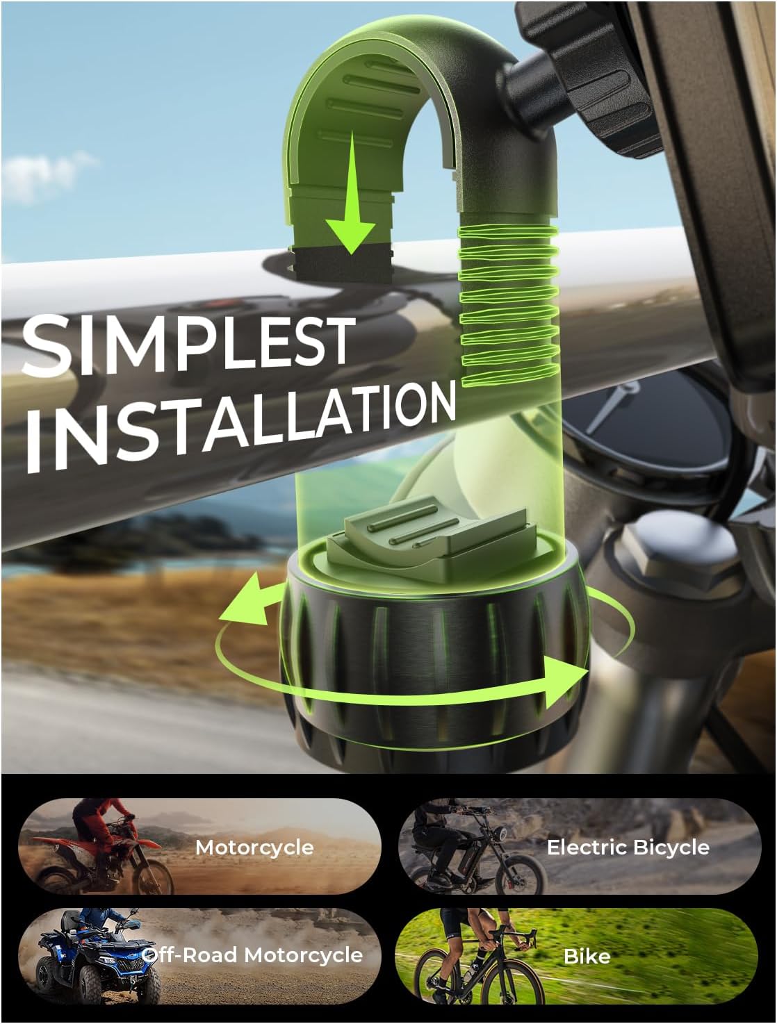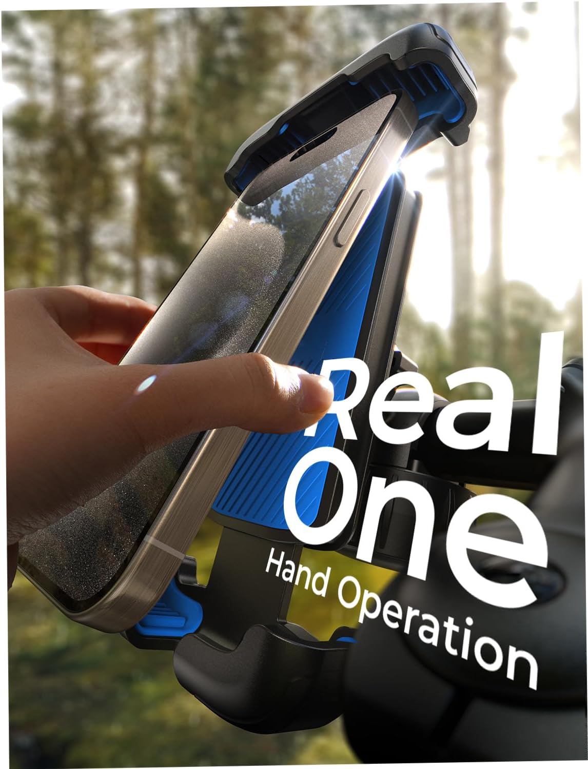 [Ultra-Secure for Your Phone] With our uniquely designed motorcycle phone mount, whether navigating bumpy roads or high-speed roads, your phone remains securely fastened to your handlebar. Its innovative shape firmly secures each corner of your phone, providing excellent stability. What’s more, our bike phone holder features a robust locking mechanism. Just focusing on riding. Your phone is safe and accessible at all times.