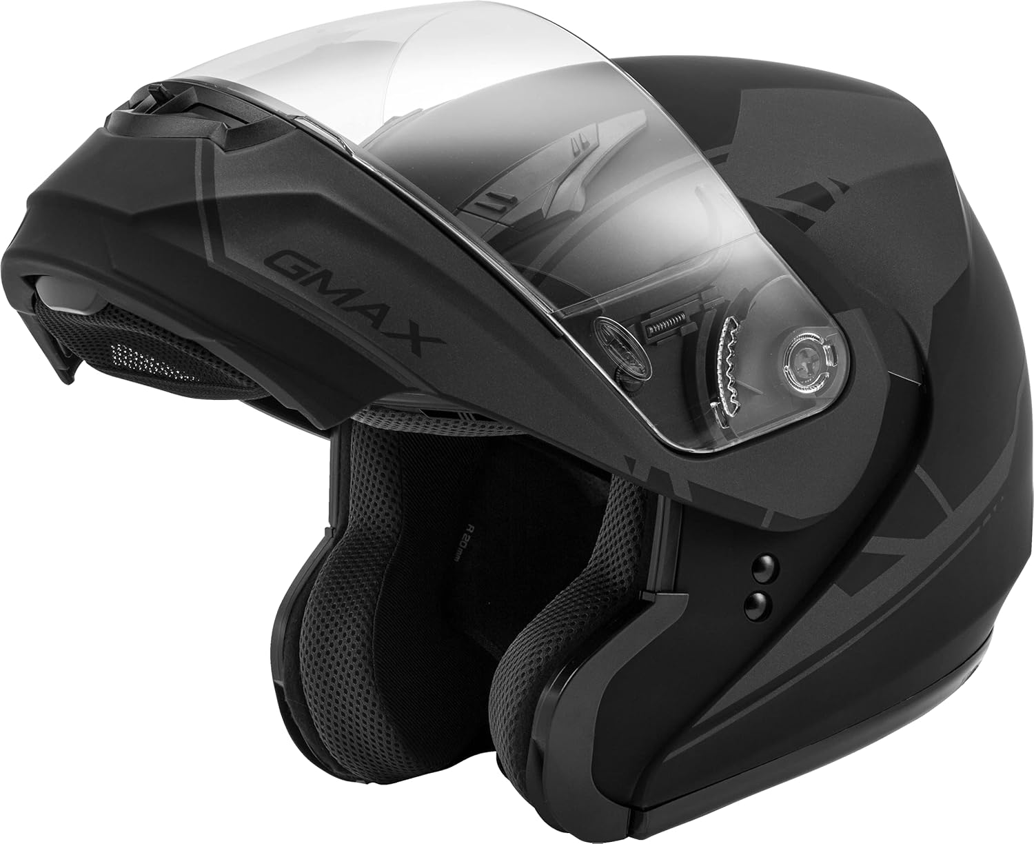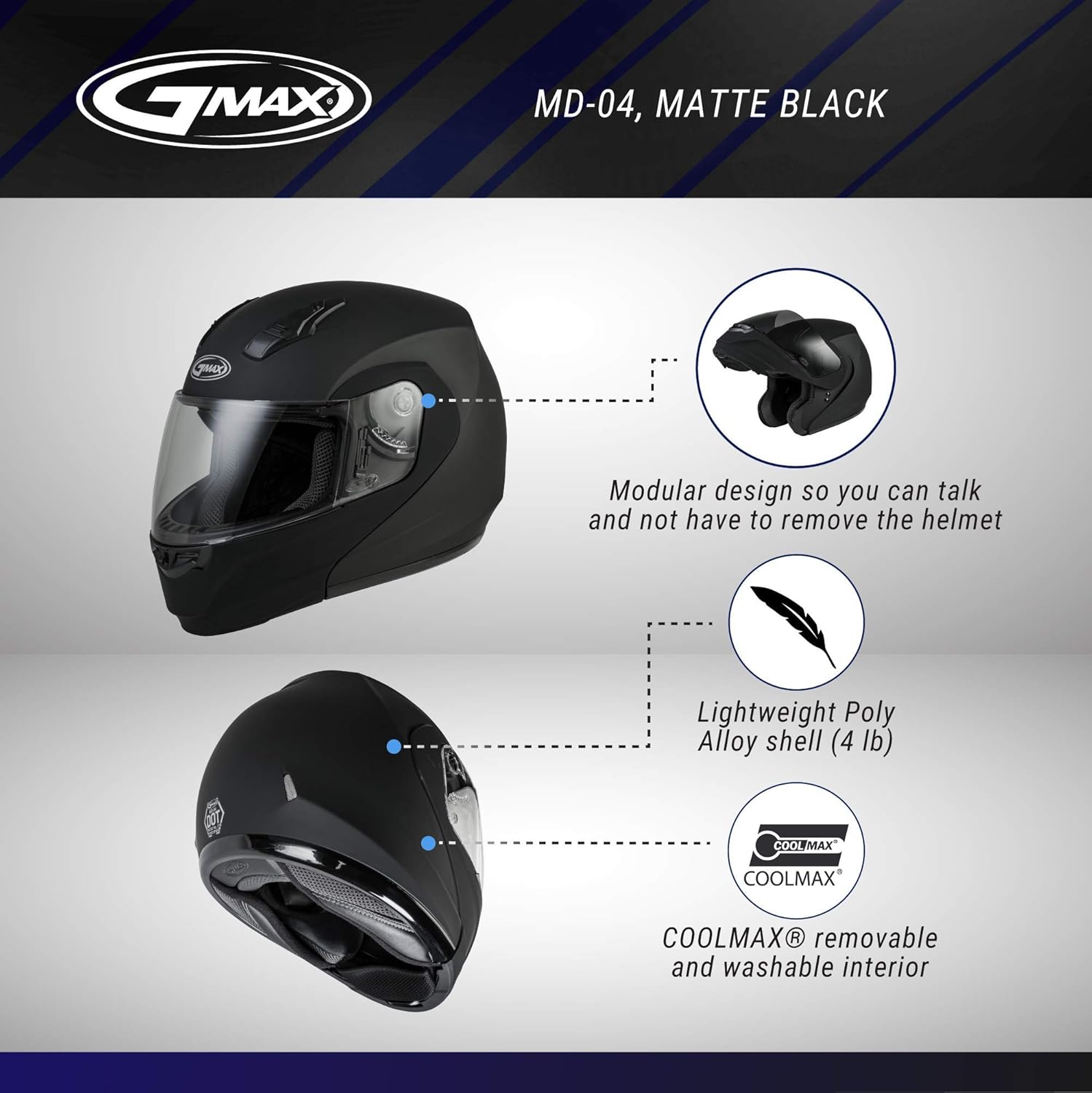 DOT Approved and Meets FMVSS 218 Standard >COOLMAX CORE technology wicks moisture away from the body and is designed to keep you dry and comfortable >Removable, adjustable and washable Coolmax interior allows for easy cleaning and custom fitting >GMAX D.E.V.S (dual exhaust venting system) top and rear vents reduce temperature by allowing hot air to escape from the top of the helmet >Vents close to completely seal out the cold >Adjustable mouth vent directs air upward across the inside the shield to help reduce fogging >Lightweight Poly Alloy shell. Large size only 4 lbs. >Easy to use chin bar with push to open mechanism designed for use with gloves >100% UV400 protection face shield that comes anti-scratch hard coated for a longer lasting clear view >Intercom Compatible >