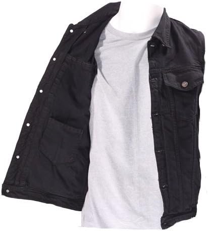 Men’s black denim vest with gun pockets. This mens black denim vest features snap down collar, tough durable denim, adjustable side buttons for better fit, 5 buttons to close the vest, 4 outside pockets, and 2 inside pockets For vests best fit, follow measuring guidlines in bullet point 5.