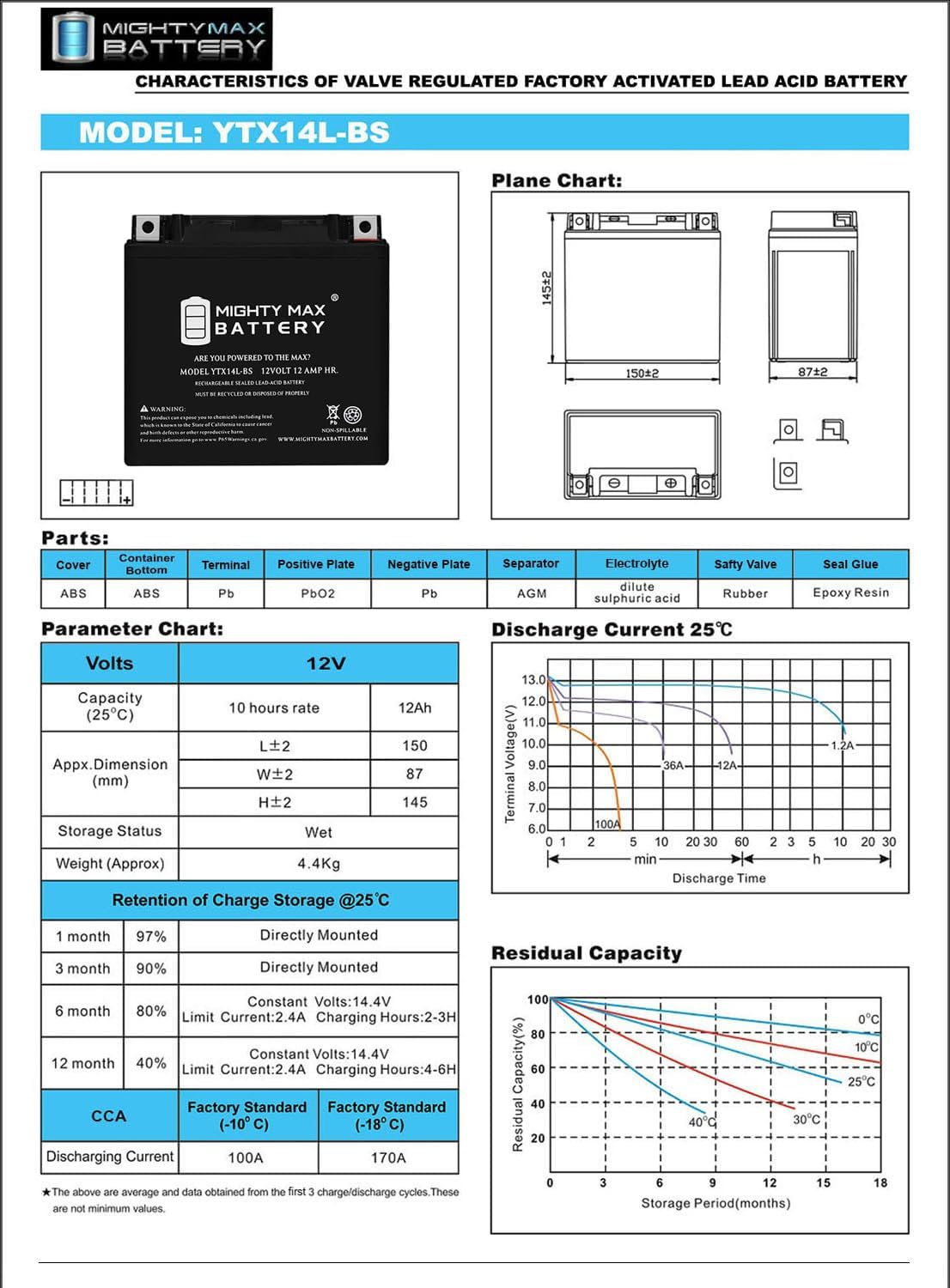 YTX14L-BS is a 12V 12AH 200 Cold Cranking Amps (CCA) Sealed Lead Acid (SLA) Battery