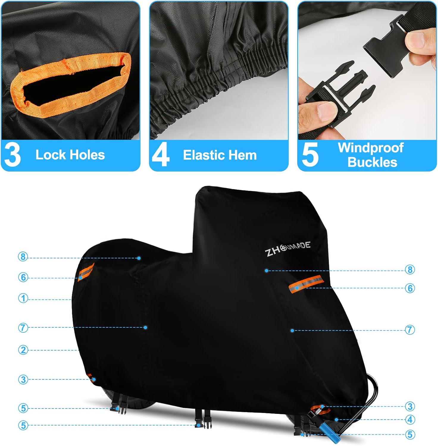 3 fixed buckles at the bottom of the motorcycle cover small, you can adjust the length of the buckles for better windproof.