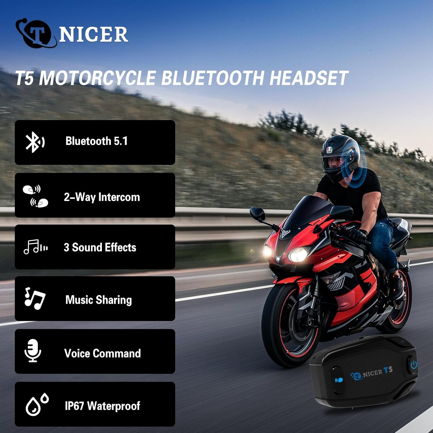 [2 Riders Intercom] The TNICER T5 motorcycle Bluetooth headset uses an optimized Qualcomm Bluetooth 5.1 chip that is highly stable and maintains low energy consumption. Supports 2 riders real-time intercom, and the maximum effective communication distance between two motorcycles is about 500 meters if there are no obstacles such as buildings.