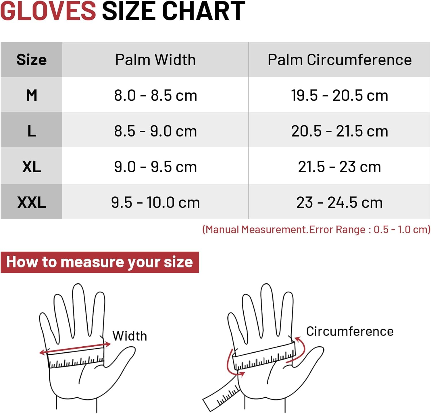 Available Sizes—OUMURS gloves are available in four sizes: M, L, XL and XXL, catering to a variety of palm widths or hand circumferences. Selecting the right size ensures a perfect fit that is neither too tight nor too loose, offering optimal comfort and protection. Customers are advised to choose the size that best fits their palm width or hand circumference for the best experience.