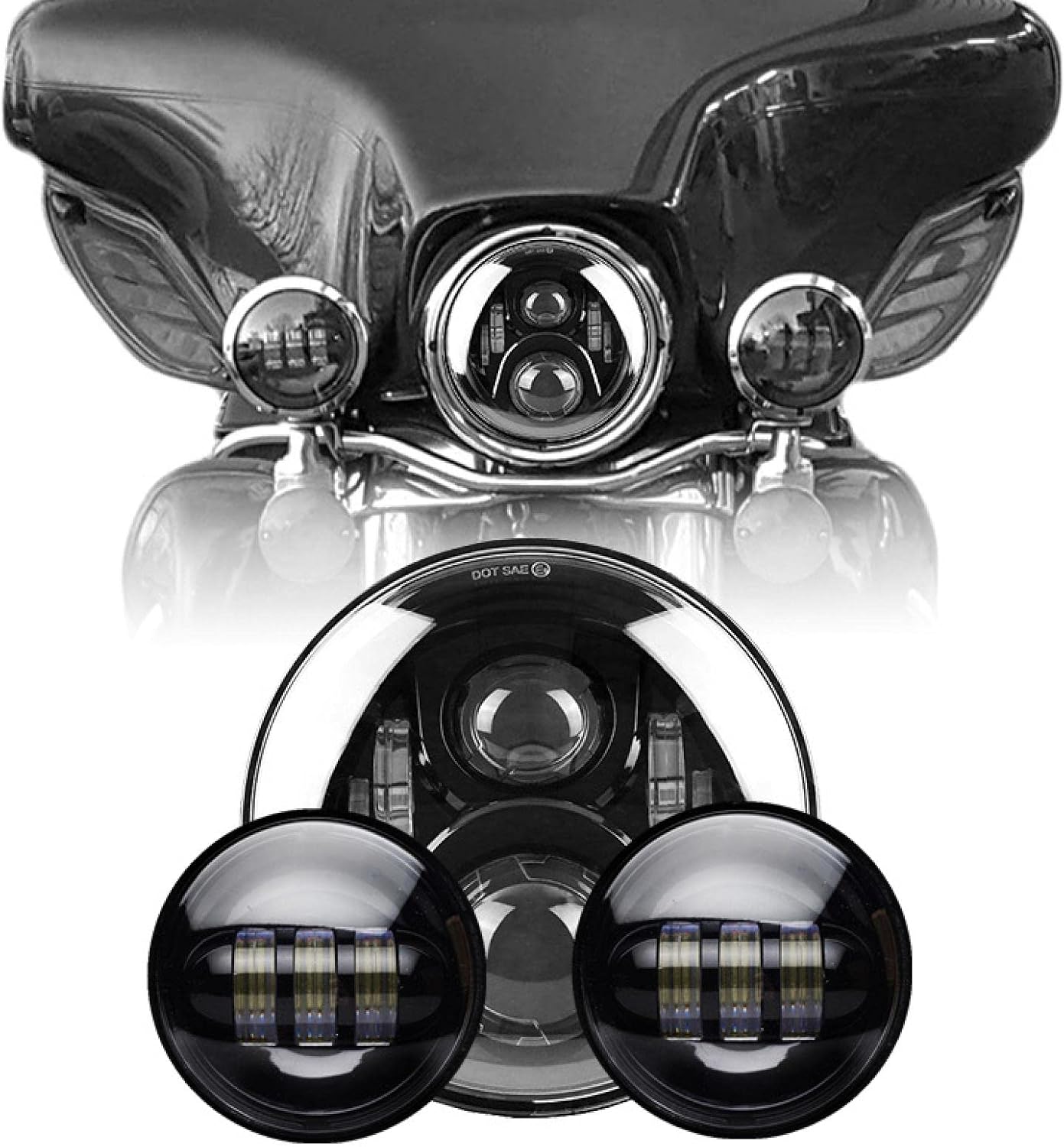 ★【Compatibility】Please compare the pictures and applicable models provided by our products before purchasing to ensure that our products are the products you need, so as not to be unusable after purchase. (Please read the product information and photos carefully before ordering to make sure it fits your car.) For motorcycle 7 Inch Round Headlight + 2PCS 4.5 Inch Passing Fog Light