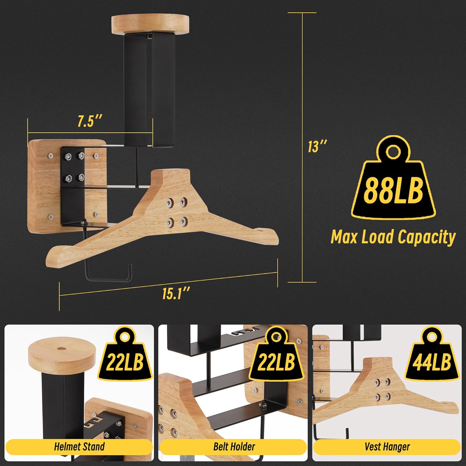 【Sturdy & Durable Load Capacity】: Tactical helmet Wall Mount can hold up to 88lbs, making it a sturdy and reliable storage solution for your motorcycle&tactical gear. It has a helmet rack capacity of 22lbs, vest hanger rack capacity of 44lbs, and belt rack capacity of 22lbs, ensuring that your equipment is safe and secure.
