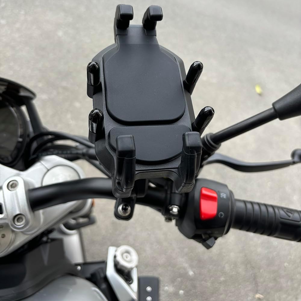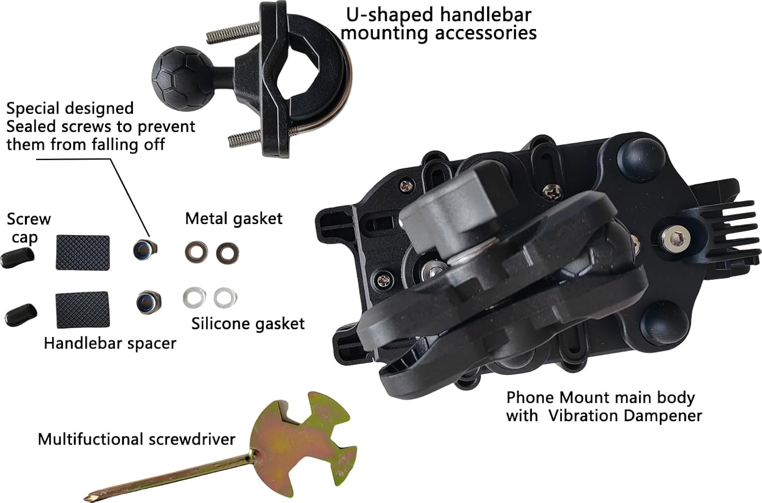Sturdy and Secure -The main body of this motorcycle phone mount is made of high-strength material, with built-in high-quality 304 stainless steel telescopic rods. Adopts aluminum alloy handlebar mounting base,Equipped with specially designed anti-slip and wear-resistant universal ball that can be adjusted 360° and not loosen