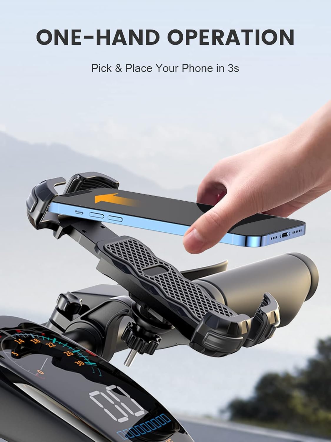 🏍️【Security Lock-Keep Your Phone Safe】The four-arm lock system with the unique safe switch of this motorcycle phone holder will keep your phone in place, and it can withstand short drops and dings while encountering an accidental fall.