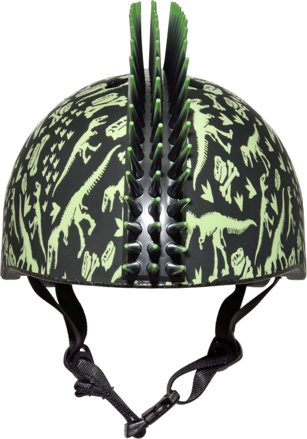 Make a ferocious statement with the Raskullz T-Rex Bonez Mohawk Toddler Bike Helmet in green and black. This dinosaur-inspired bike helmet has bright green dinosaur skeleton images printed over the entire helmet. It also features an eye-catching 2” tall bendable black 3D mohawk with bright green tips. Perfect for tearing it up like a dinosaur on a bike, scooter, or skateboard. Recommended for ages 3-5 years old with heads measuring 48-52cm.